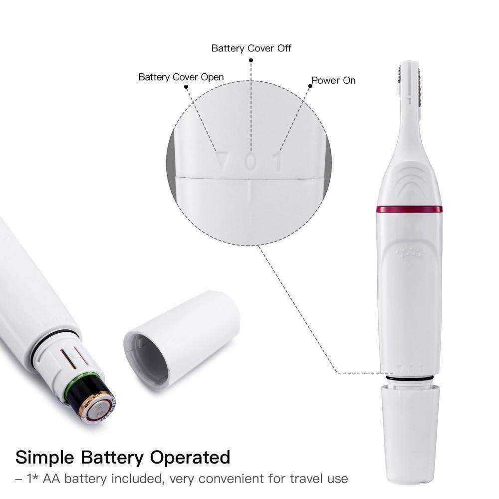 - 5 i 1 øyenbrynstrimmer drives av et medfølgende AA-batteri (merk: batteri er ikke inkludert i pakken), dette settet for kroppshår og bikini er svært brukervennlig.