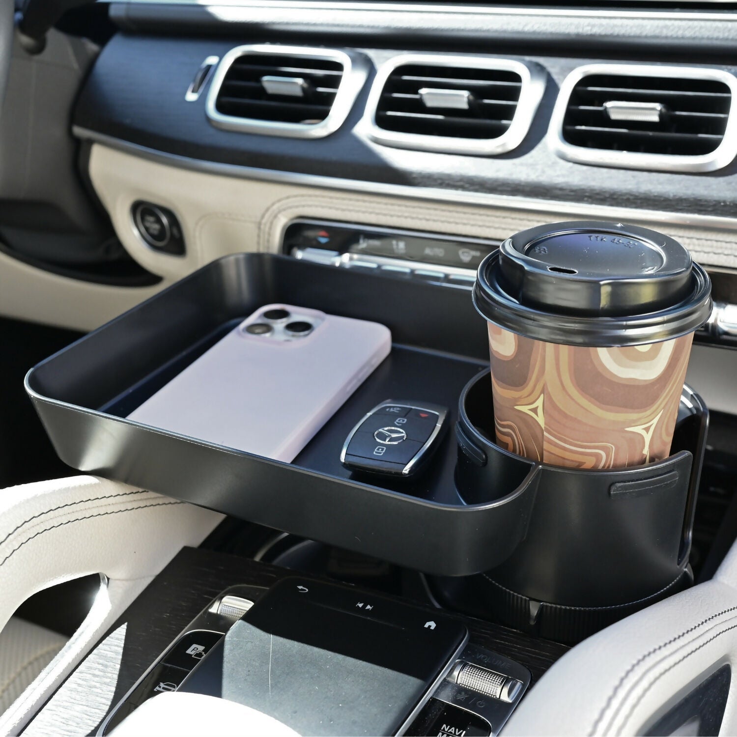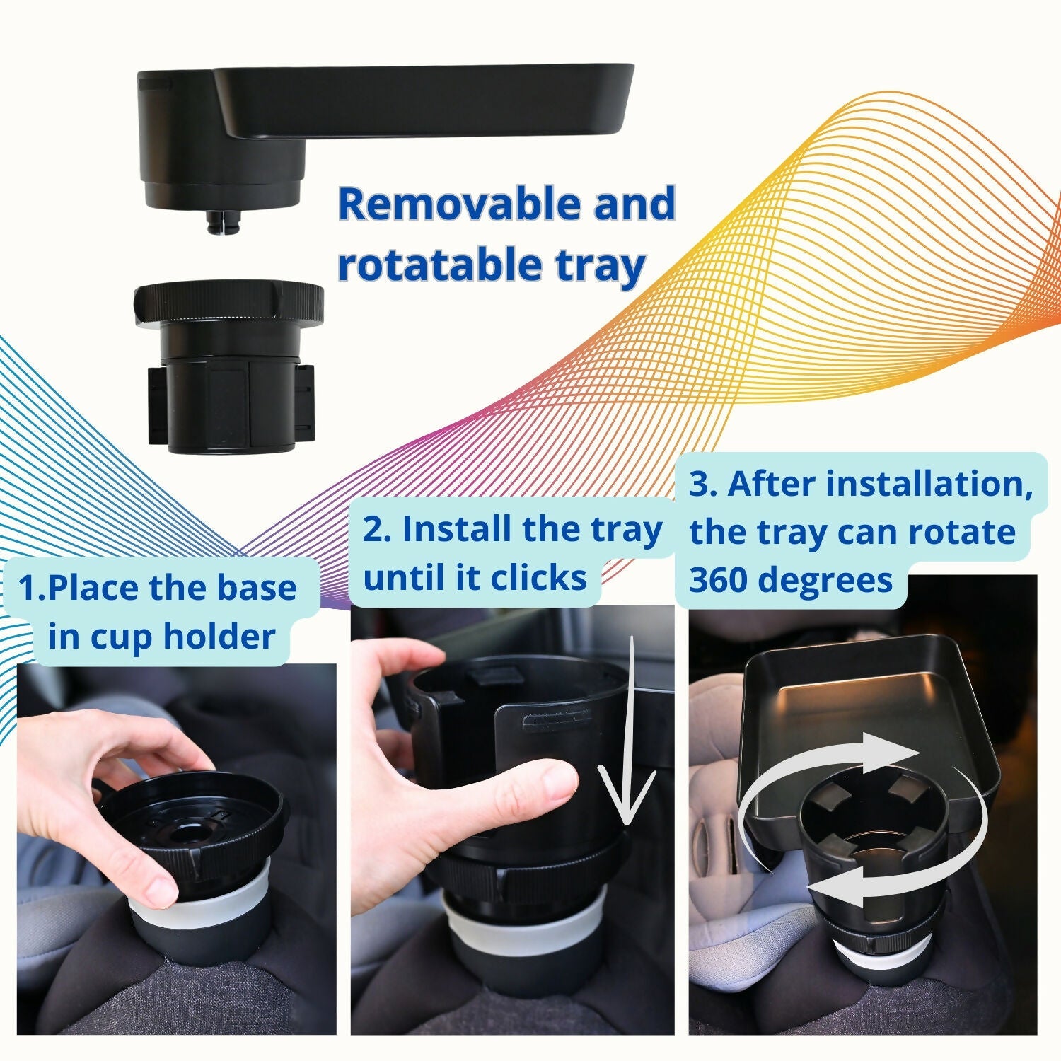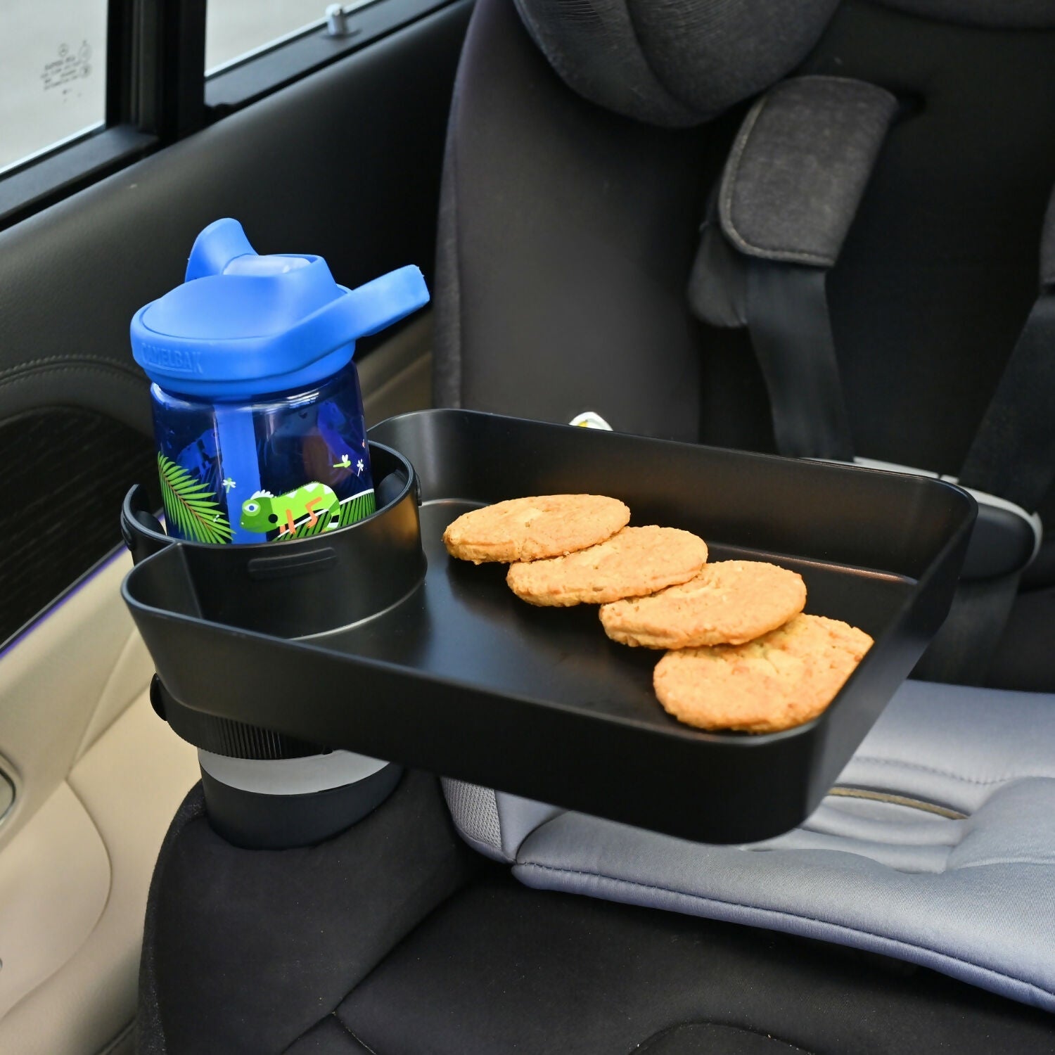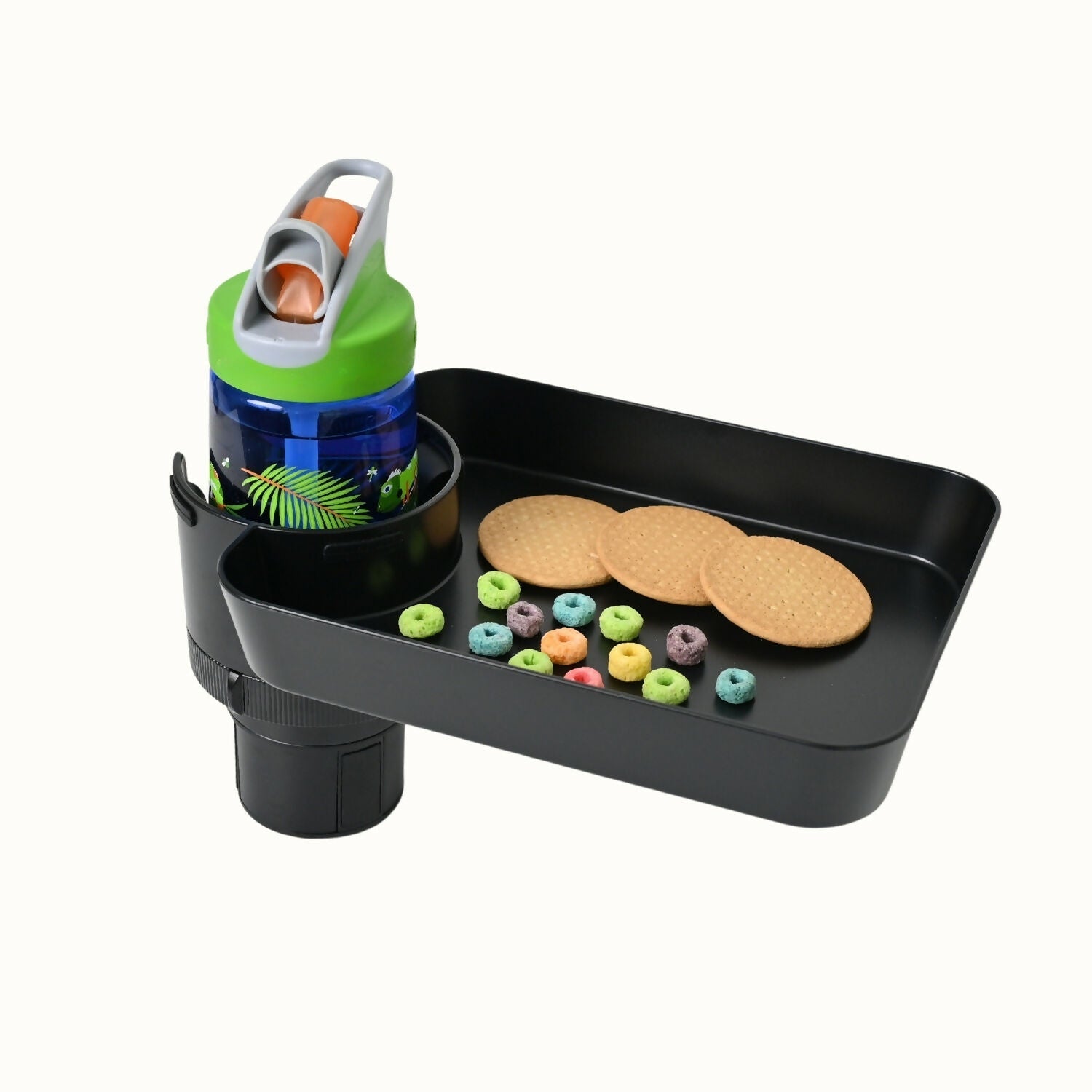 Snacks når som helst! Hold snacks og drikkevarer til ditt barn trygt med dette barnevennlige reiseorganiseringsverktøyet! Ingen flere søl i bilen - dette brettet har hevede kanter for å holde maten på plass, samt en spesialdesignet koppholder som forhindrer søl. Det roterer 360° og passer til de fleste koppholdere, så om du er på biltur, i kinoen, eller skyver en barnevogn, har snacktiden blitt mye enklere!