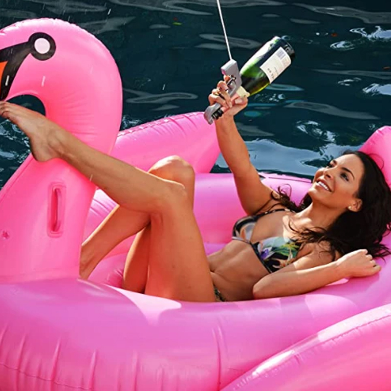 - Enkel å bruke - For å bruke ølpistolen, plasser en champagneflaske eller en annen flaske på dysen, rist den litt, og skyte sprudlende drikke mot vennene dine.