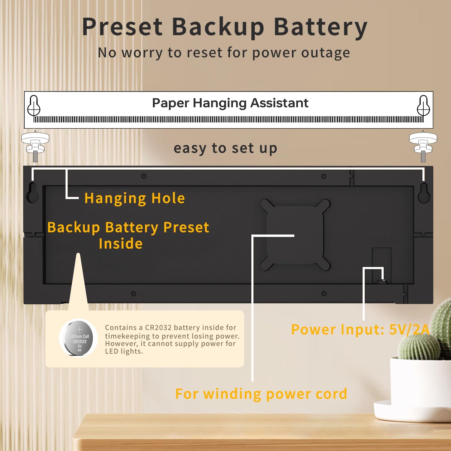 Denne digitale vekkerklokken på 16 tommer kombinerer iøynefallende synlighet med moderne funksjoner. Den har en 8 RGB fargedisplay (4 faste + 4 gradient), som gir deg muligheten til å tilpasse utseendet samtidig som den sikrer god lesbarhet fra motsatt side av rommet. Med dual vekker og et høyt lydnivå opp til 115 dB, er den perfekt for både lette og dype sovere, inkludert eldre. Den justerbare lysstyrken med automatisk demping holder skjermen behagelig både dag og natt, og et innebygd nattlys tilfører en koselig atmosfære til rommet ditt. Andre funksjoner inkluderer en nedtellingstimer, 12/24-timers tidsformat, dato- og temperaturvisning, samt en praktisk fjernkontroll for raske innstillinger. Den er designet for å stå på bordet eller monteres på veggen, og drives av den medfølgende 5 V-adapteren for jevn drift.