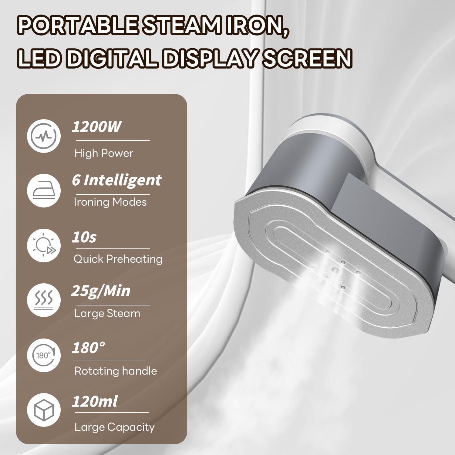 Denne 2-i-1 dampstrykejern kombinerer tørr og dampstrykking med fem forskjellige dampinnstillinger for allsidig bruk. Med 1200W effekt genererer den kraftig damp og er klar til bruk på bare 10 sekunder. Det 180° sammenleggbare designet gjør den enkel å transportere med en vekt på kun 0,45 kg, ideell for reise. Den 120 ml vanntanken gir utvidet damping, mens LED-panelet gir deg seks justerbare innstillinger for ulike tekstiler.