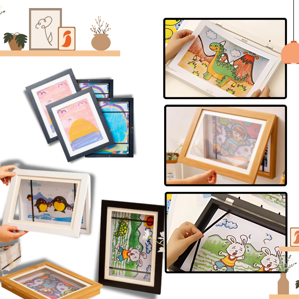 Takket være Enkelt Bytte av Kunstverk-funksjonen er det like enkelt å oppdatere skjermen som det er for barnet ditt å skape et nytt mesterverk. Rammene er designet med tanke på bekvemmelighet, slik at du raskt kan åpne rammen og bytte ut kunstverket uten problemer. Dette gjør den ideell for å vise frem barnas stadig utviklende kreativitet der det alltid skapes nye tegninger, malerier eller håndverksprosjekter. Enten det er et høytidstema eller det nyeste skoleprosjektet, sørger den enkle åpningsmekanismen for at du kan bytte ut kunstverkene på få minutter, slik at utstillingen holder seg frisk og gjenspeiler barnets aktuelle inspirasjon.