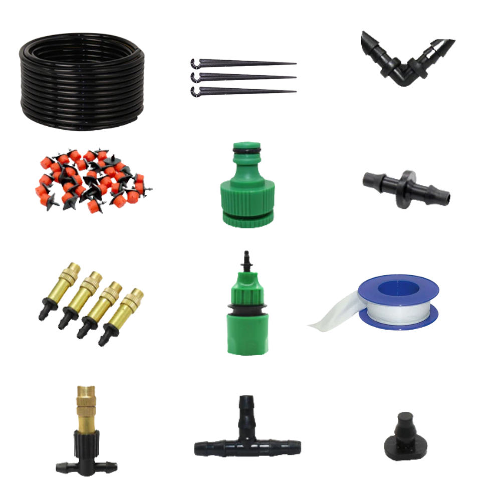 Dette vanningssystemet er også enkelt å installere. Du trenger ikke rørleggerarbeid eller annen spesialkunnskap. Vi har lagt ved noen enkle illustrasjoner som hjelper deg med å sette sammen settet. Alt du trenger å gjøre for å komme i gang er å sette inn beslag og sprøyter. Det er alt! Så du kan installere det selv.