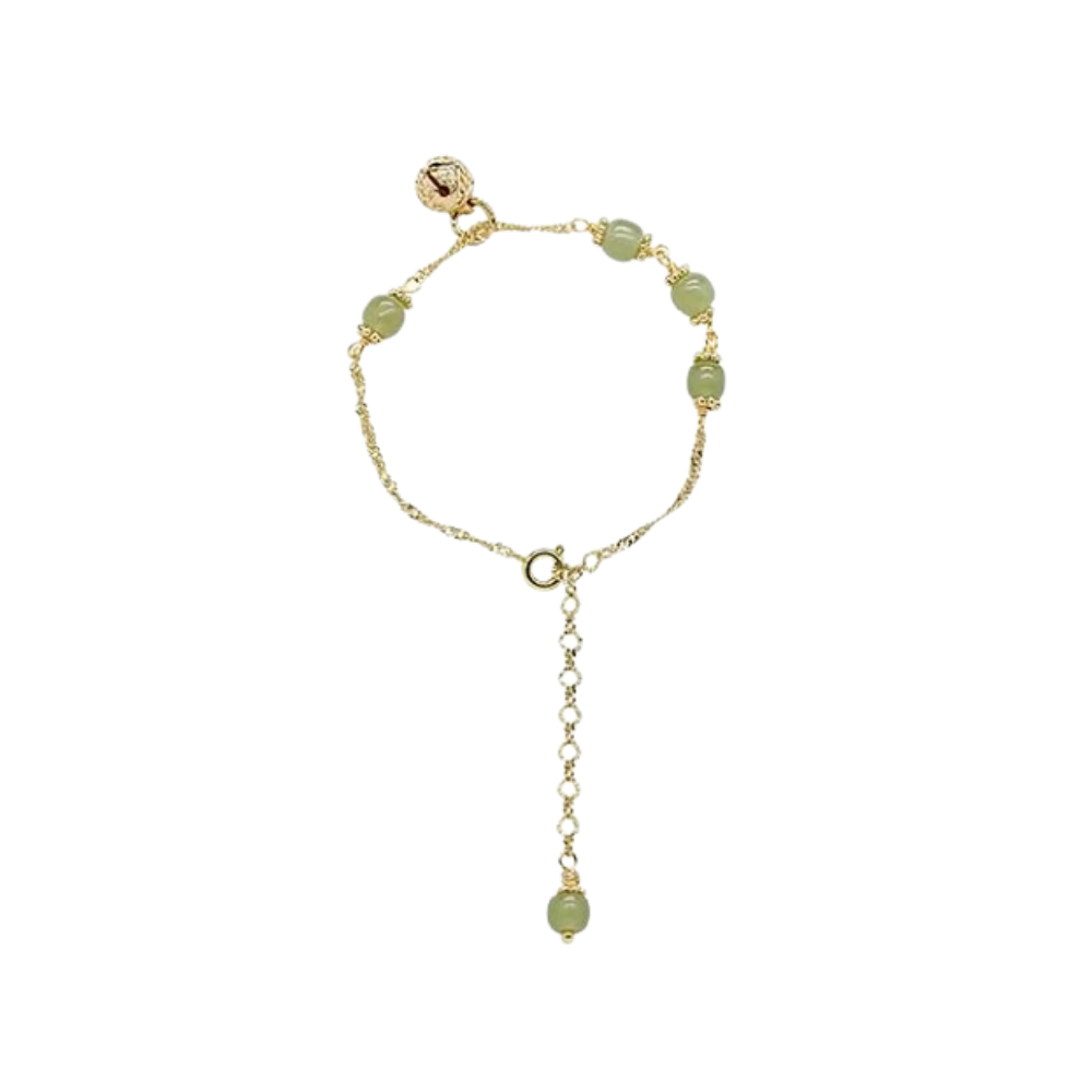 Mer enn bare formen og betydningen av dette armbåndet er unikt . Det er også laget av materialer av høy kvalitet. Det 14K gullbelagte metallet er slitasjebestandig og designet for å vare lenge. De dekorative elementene laget av nefritstein vil gi armbåndet et spesielt preg. Nyt 5 vakre steinperler og en skinnende bjelle.