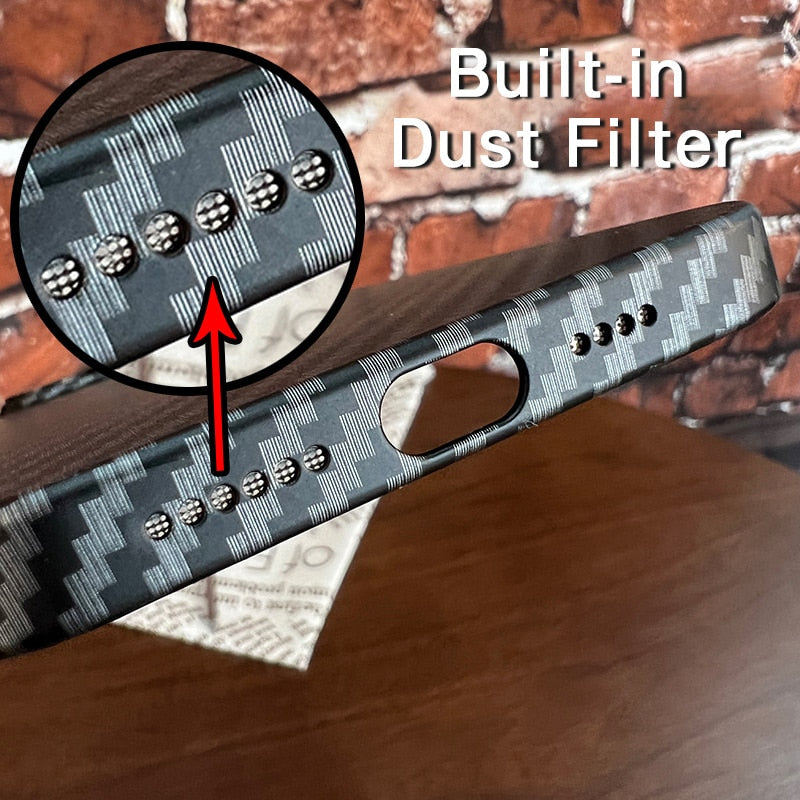 iPhone-dekslet er laget av karbonfiber. Den magnetiske lukkingen sikrer at telefonen din forblir sikkert på plass, mens det holdbare bumperet beskytter mot smuss, riper, bulker og støt.