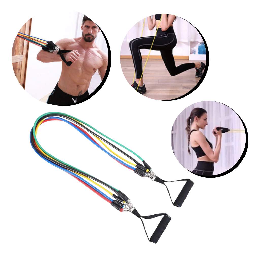 Integrer trening i din livsstil. Dette komplette motstandsbåndsettet inneholder 5 forskjellige elastiske trekkbånd for å gjøre det enkelt å trene hvor som helst. Båndene kommer i forskjellige farger og motstand: gul (5kg), rød (8kg), blå (12kg), grønn (18kg) og svart (22kg). Hvert bånd er 92 cm langt . Bruk dem alene eller stable dem i ønsket kombinasjon. Motstandsbåndene har en total motstand på 70 kg når de brukes sammen.