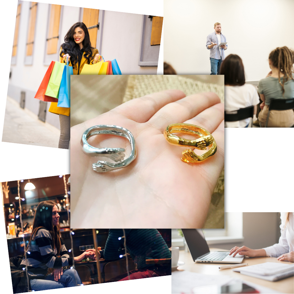 Vi elsker klemmer, gjør vi ikke? En klem er et symbol på nærhet, trygghet, tillit og kjærlighet. Det er en ekstremt viktig del av livet og forholdet vårt. Vi elsker også smykker. Hvem liker ikke å få en fin, original ring? Hva om vi kunne sette disse to sammen og lage en ring som representerer en klem? Ville ikke det vært genialt? Vel, vi har noen gode nyheter til deg - denne unike klem ringen er tilgjengelig her og venter på deg! Er ikke det flott?