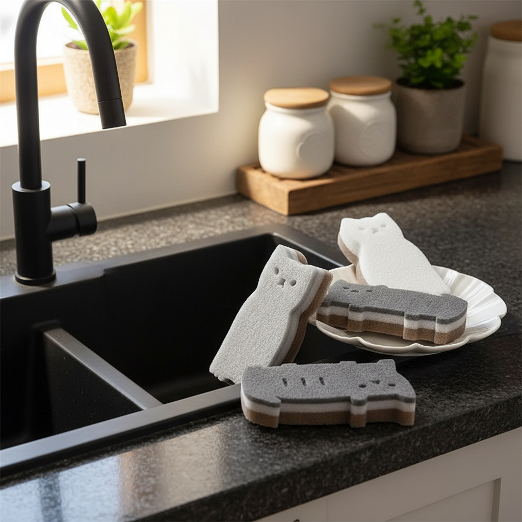 Mini Kat Multi-Purpose Rengjøringssvamp er en sjarmerende katteformet svamp designet for effektiv oppvask og rengjøring av ulike overflater. En morsom, gjenbrukbar og skånsom svamp som holder hjemmet ditt plettfritt med stil.
