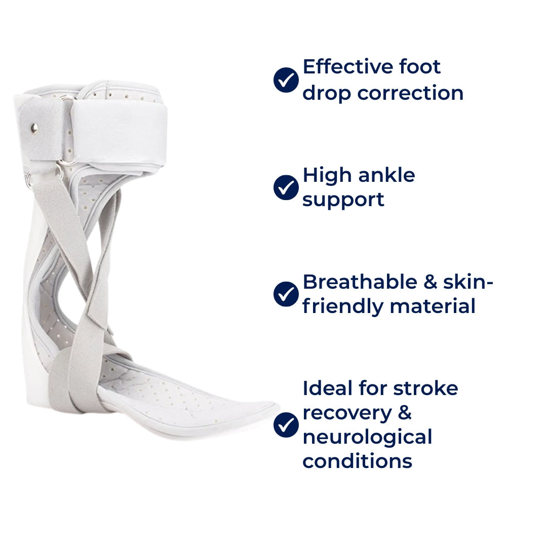 NeuroStride Foot Drop Support bidrar til å rette opp droppfot forårsaket av slag, nervebesvær eller stramme hælsener ved å holde foten i korrekt posisjon uten å påføre ubehag på hælen.