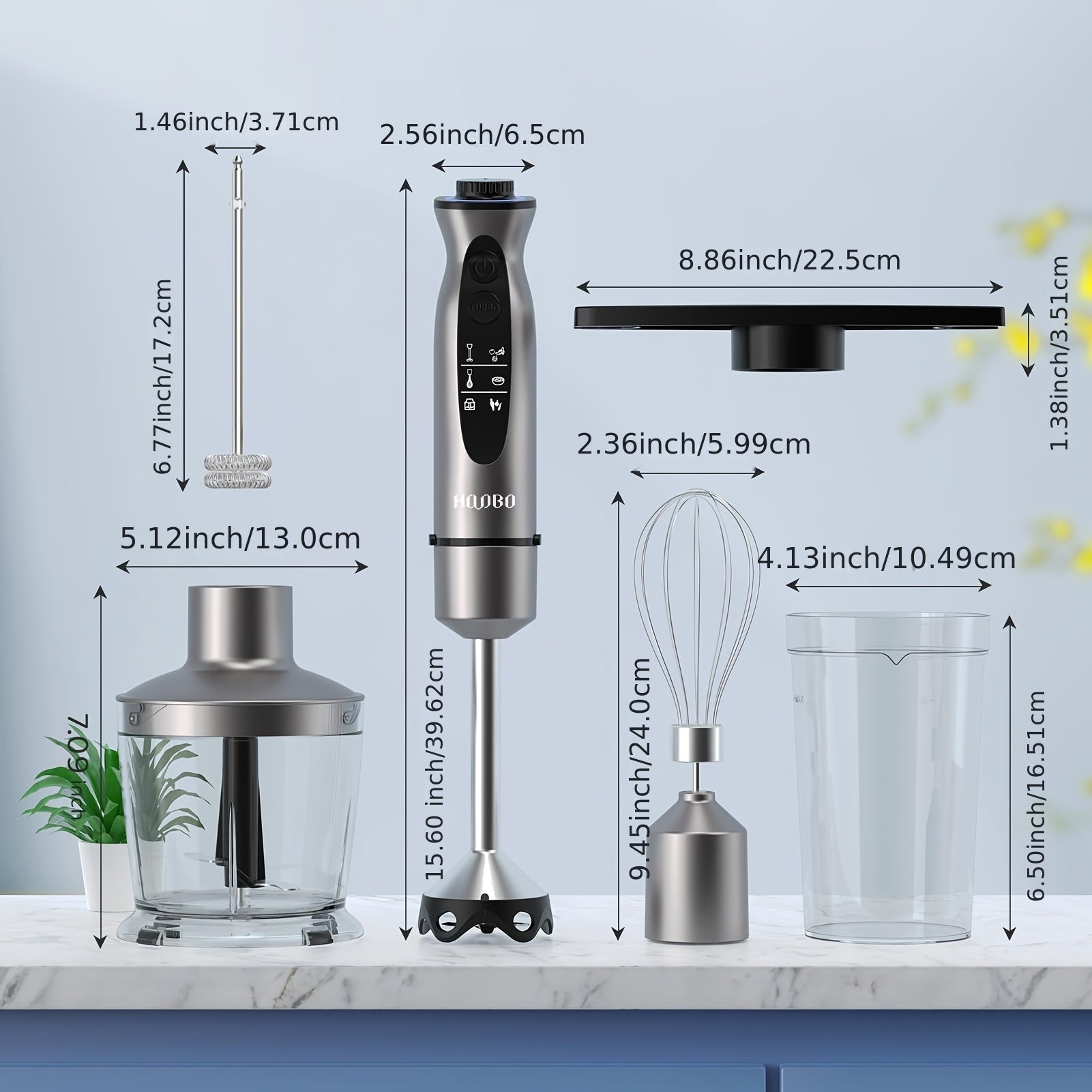 - Fleksible vedlegg for alle oppgaver: Denne håndmikseren er ikke bare for blanding - den leveres med et målebeger, en hakker, en visp og en melkeskummer, noe som gjør den til et allsidig kjøkkenverktøy. Fra hakkede urter til skummet melk til latte macchiato, gjør denne mikseren alt med stil.