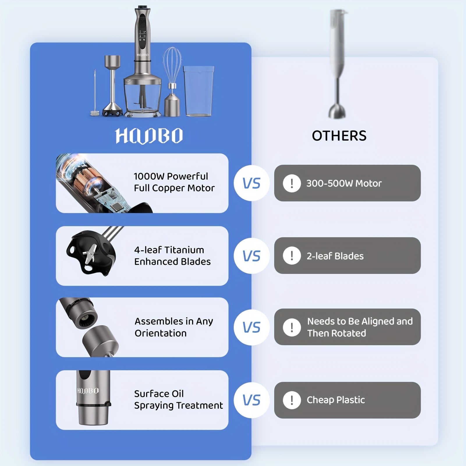 Forbedre matlagingen din med 1000W håndmikseren, en kraftig hjelpemann på kjøkkenet som er laget for å dekke alle dine behov innen blanding, hakking, pisking og skumming. Den trinnløse hastighetskontrollen med 12 innstillinger og en turbomodus gir deg nøyaktig kontroll for hver oppskrift. Den stillegående driften skaper en behagelig matlagingsopplevelse, mens det ripefrie designet tar vare på redskapene dine. Enten du lager smoothie, suppe, sauser eller skummende drikker, vil denne håndmikseren bli din uunnværlige følgesvenn på kjøkkenet.