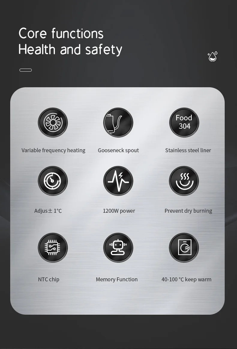Forbedre bryggeopplevelsen din med den 1200W intelligente elektriske vannkokeren med konstant temperatur, som er designet for presise bryggetemperaturer, enten du ønsker å lage håndbrygget kaffe, varme melkepulver eller bare varme opp væsker. Denne allsidige vannkokeren kombinerer stilfullt design med banebrytende teknologi og er det ideelle tilskuddet til ditt kjøkken eller kaffehjørne.