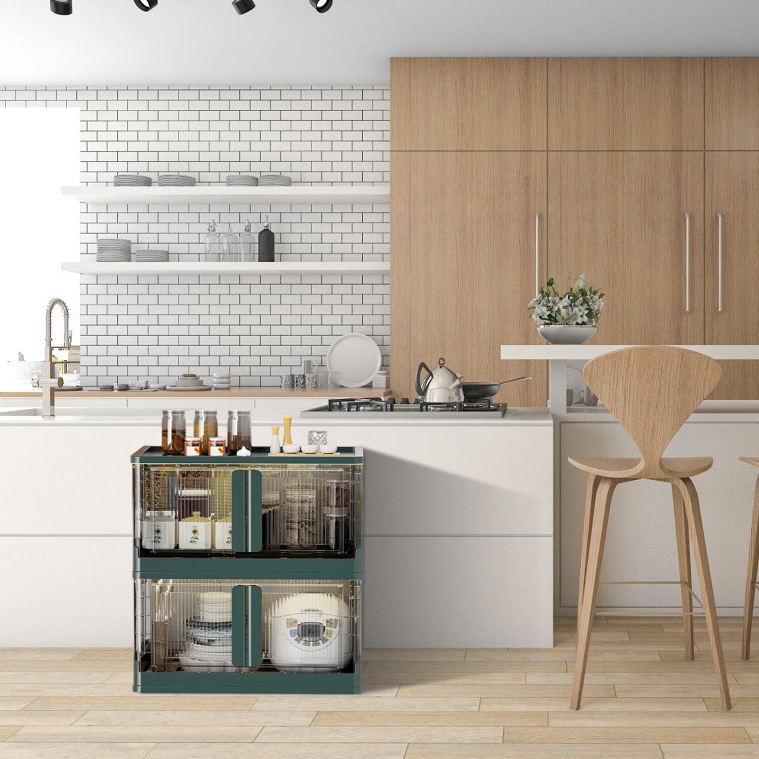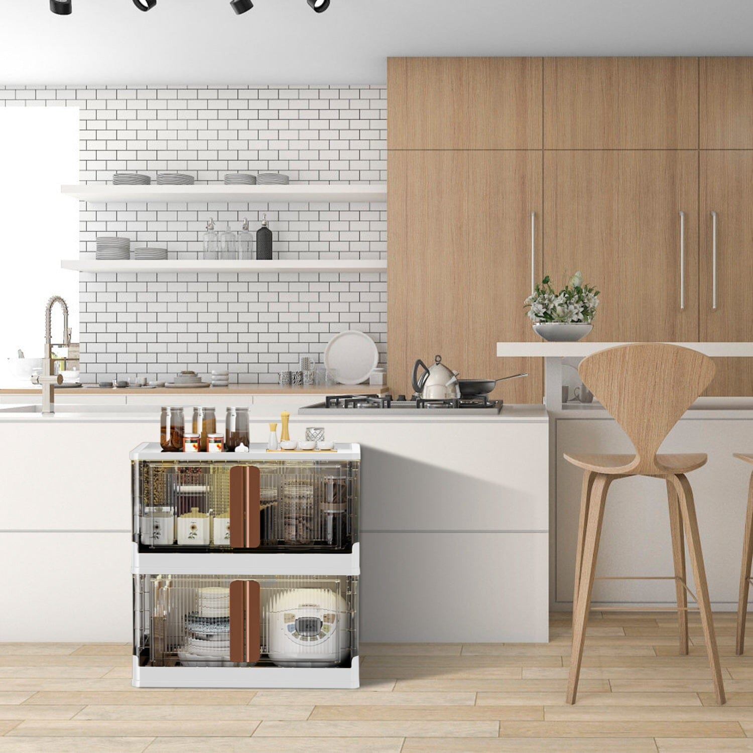 - Enkel tilgang fra toppen og foran: Den sammenleggbare oppbevaringsløsningen tillater to ulike metoder for åpning. Du kan enkelt heve lokket eller åpne frontdøren. Frontdøren har låsemekanismer som aktiveres ved å vri på håndtakene, noe som sikrer at dørene holdes lukket under transport. Fronttilgangen er brukervennlig, slik at du lett kan hente ting uten å måtte ta bort alt eller flytte ting fra toppen. Topplokket beskytter eiendelene dine mot støv.