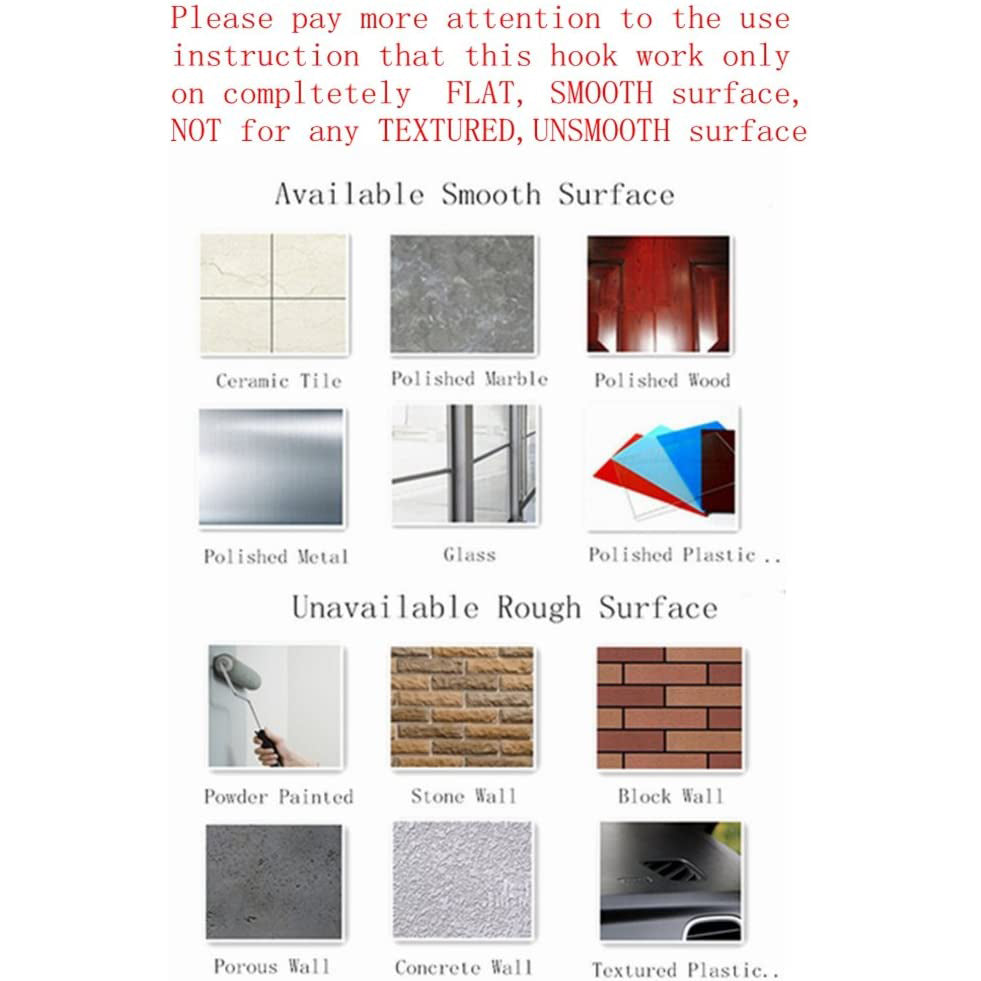 - Viktig: Denne varen leveres i et sett med to kroker og fungerer kun på ikke-porøse, glatte overflater som polerte keramiske fliser, speil, vinduer, polert rustfritt stål og plastplater. Den er ikke egnet for porøse, ujevne, grove eller teksturerte overflater, som ru finish, upolert marmor, tre eller grov porselen, osv.