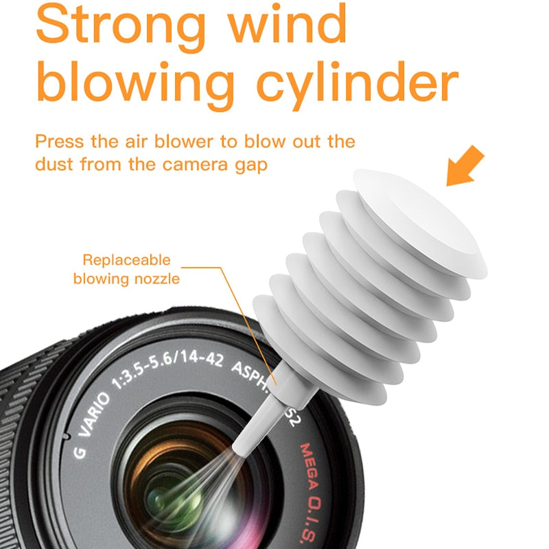 [Elektronisk rengjøringssett]: 20 i 1 elektronisk rengjøringssett: 1. Oppbevaringsboks for produkt 2. Stor rengjøringspensel 3. Klut for skjermrengjøring 4. Støvsamlerblåser (til fjerning av støv fra kameraflaten) 5. Kort stang for luftblåsing 6. Forlengelsesstang til tilbehør (for å forlenge håndtaket til tilbehør) 7. Rens for skjerm 8. Liten hard børste 9. Liten myk børste 10. Verktøy for å trekke av deksler 11. Kortleser 12. Verktøy for å ta ut nøkkeler 13. Liten vinkelbørste 14. Rengjøringsverktøy for øretelefonrom 15. Børste til øretelefoner 16. Spiss til rensepenn 17. Myk kort børste 18. Børste for lading av øretelefonrom 19. Børste til kameraskjerm 20. Forlengelsesstang for luftblåsing
