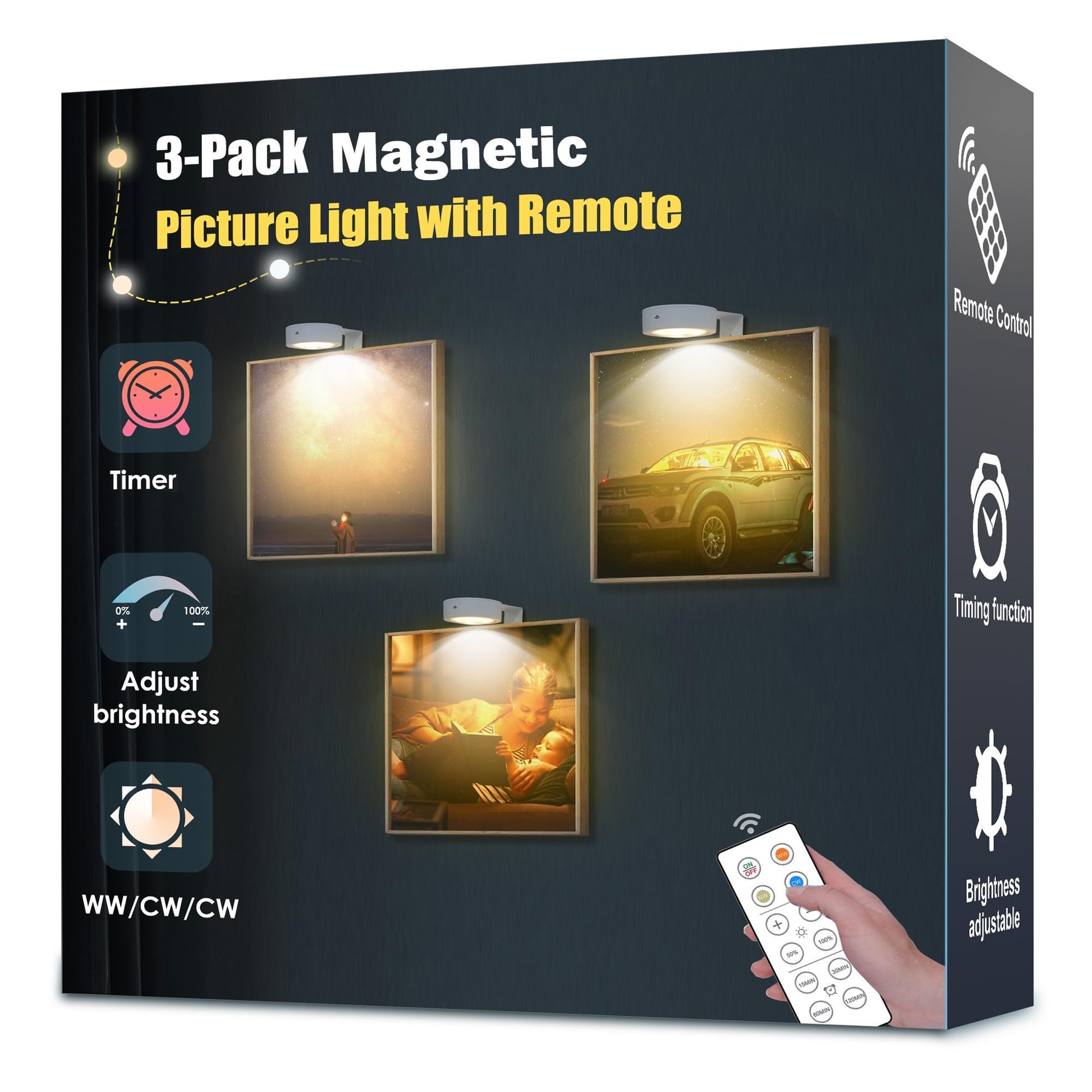 Sett med tre LED-lamper for belysning av bilder og veggdekor. Lampene drives av batteri og har magnetisk feste. De leveres med fjernkontroll for enkel styring av lysstyrke og timerfunksjon. Egnet til bruk ved bilderammer, kunstutstillinger eller annen veggmontering.