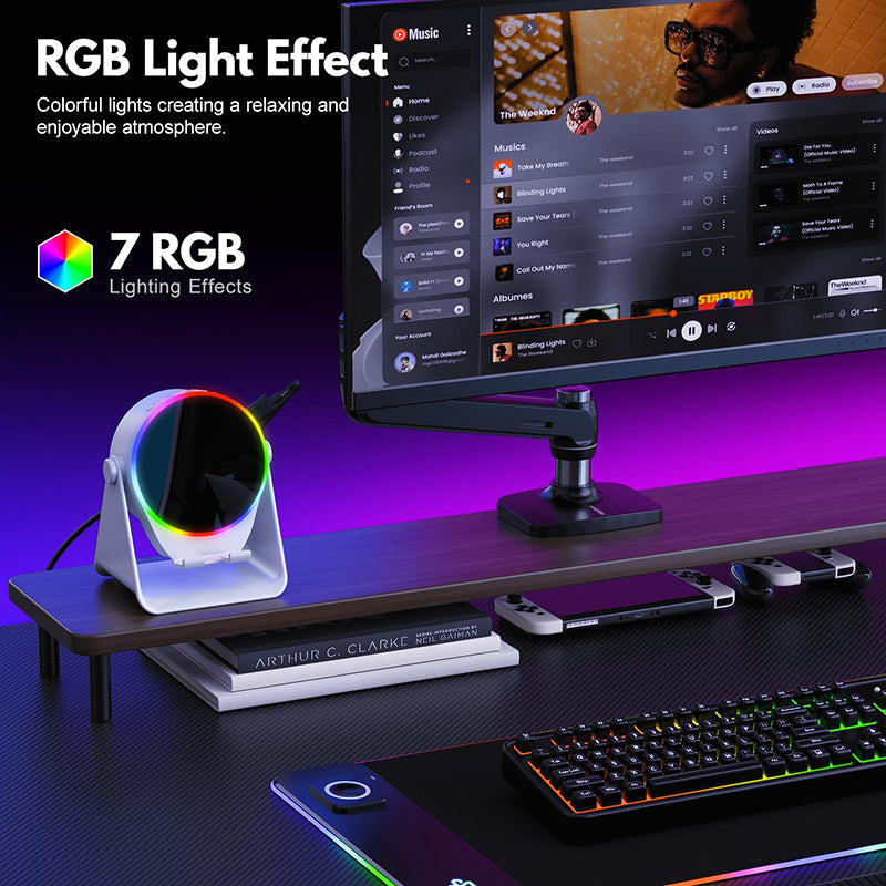 Opplev en unik og morsom 4-i-1 multifunksjonell enhet som kombinerer en trådløs induksjonshøyttaler, Bluetooth-høyttaler, mobilstativ og ambient lys.