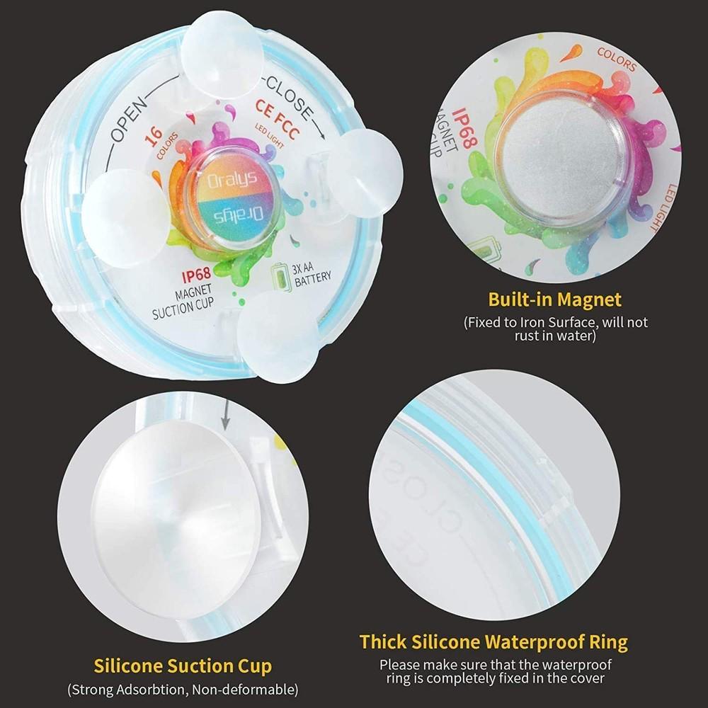 Oralys LED-bassengbelysning er laget av høykvalitets, vanntette materialer som er i samsvar med IP68-standarder. Silikonsugebekken har eksepsjonell vannabsorpsjonsevne i forhold til andre merker, og bevarer sin form selv etter langvarig bruk. MERK: Vennligst kontroller at både det øvre og nedre dekselet er sikret før det senkes i vann for å unngå at vann trenger inn. De svært lyssterke, dimbare lampene tilbyr 16 RGB-farger – Oralys LED-bassengbelysning har 15 sterke LED-lamper, 16 fargealternativer, 5 lysstyrkenivåer, og 4 dynamiske moduser, som gir et mangfold av dekorative muligheter for hverdagslig eller festlig bruk i bassenger, dammer, fontener, akvarier, fisketanker, vaser, blomsterpotter og badekar.