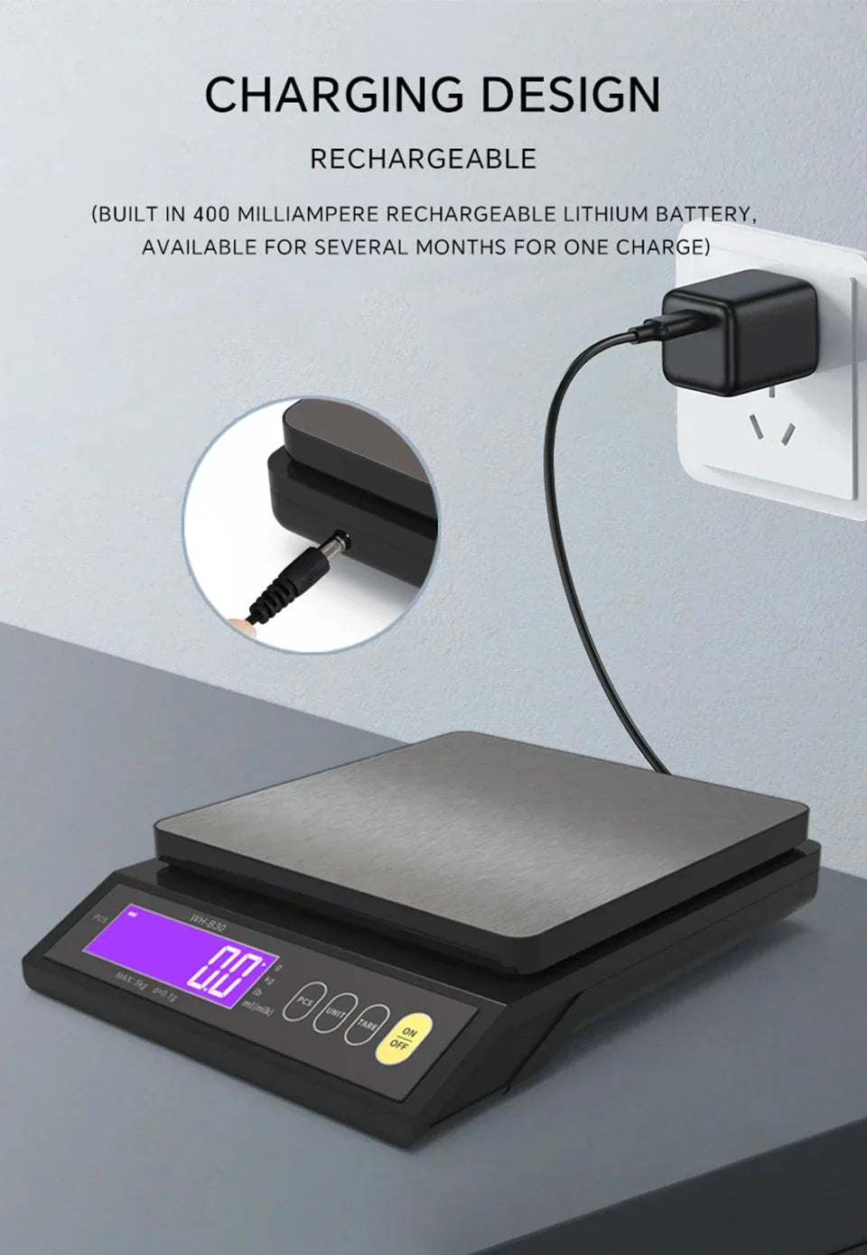 Ikke flere bekymringer angående batteriskift! Denne vekten drives av et integrert 400mAH litiumbatteri som enkelt kan lades via USB. Den kan også benyttes med 3 AAA-batterier eller kobles til en strømkilde for kontinuerlig drift – slik at du alltid har strøm når du lager mat.