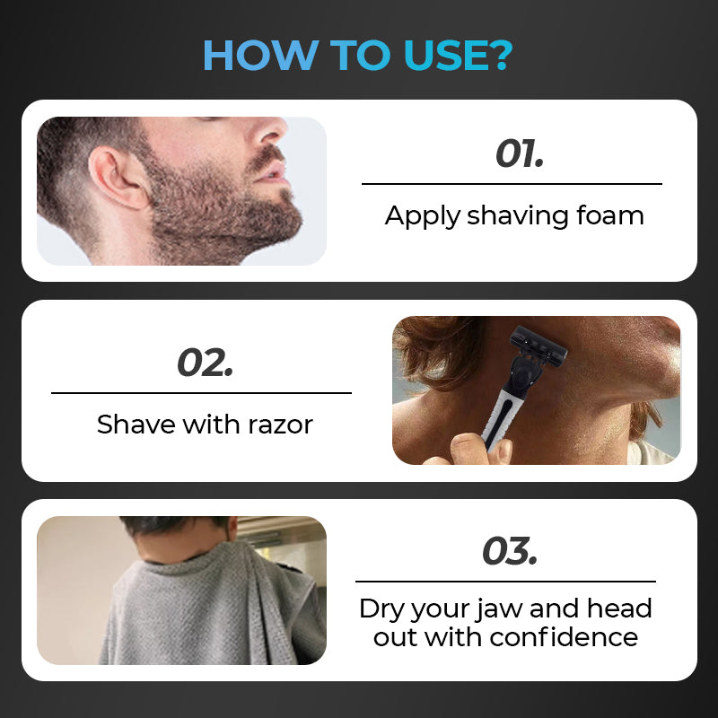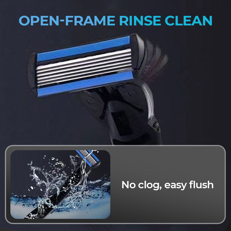 BLADER MED ÅPEN STRUKTUR FOR ENKEL SKYLLING: Den L-formede bladdesignen med en åpen ramme lar vannet strømme fritt under skylling, og skyller ut fanget hår og barberingsrester umiddelbart. Dette forhindrer tilstopping og opprettholder topp ytelse, noe som sikrer hygienisk bruk med lite vedlikehold etter hver barbering.