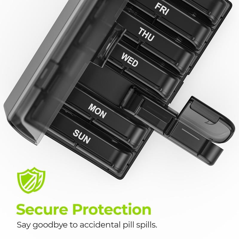 Hver daglig pilleboks passer enkelt i lommene dine, slik at du kan ta med deg medisinene uten å bli lagt merke til. Den stilige svarte ytterboksen tilbyr privatliv samtidig som den holder pillene dine trygge under reise.