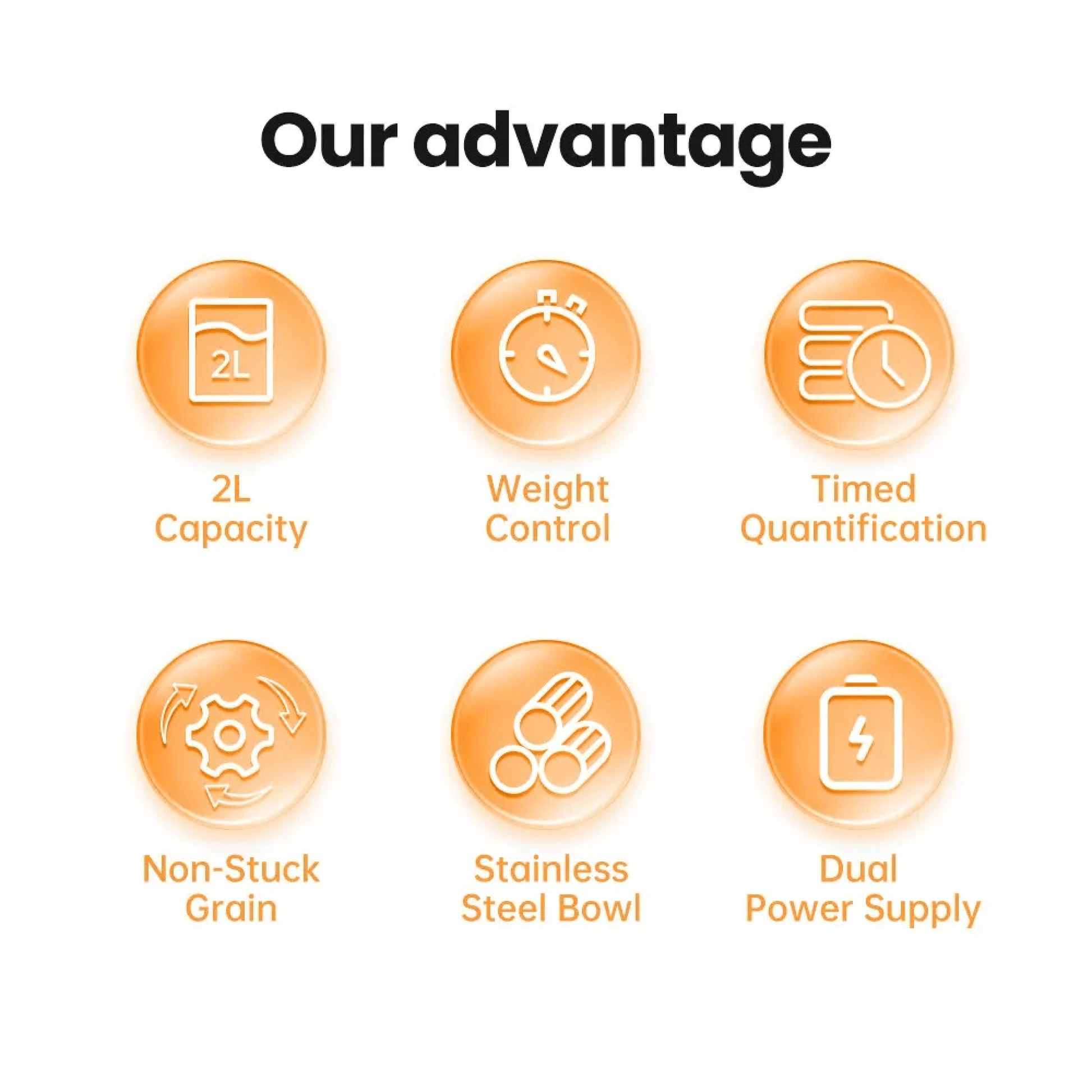 Rustfritt Stålskål og Vektkontroll: enkelt å rengjøre og svært holdbart. I tillegg sikrer de blokkfrie kornene og vektkontrollfunksjonene en behagelig matingopplevelse.