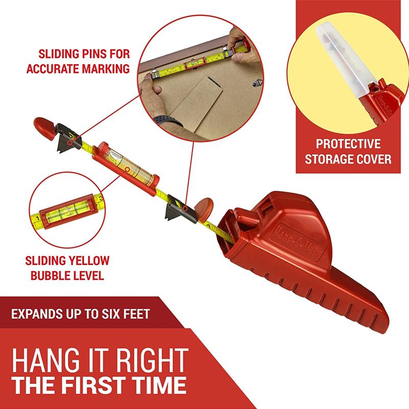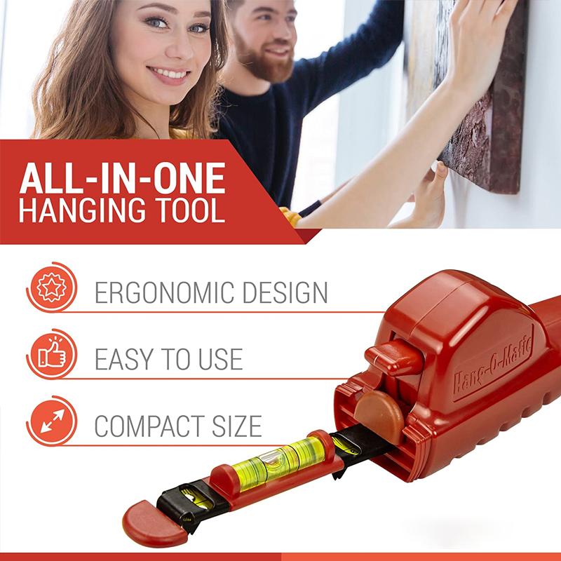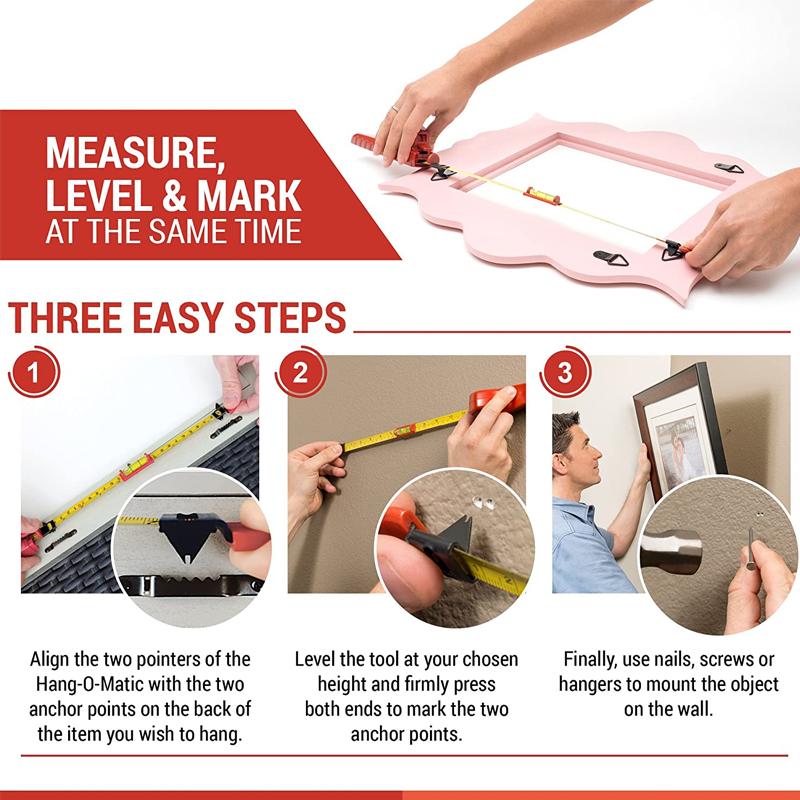 ET MANGFOLDIG HENGINGSPARAT. Å feste bilder, speil, hyller, TV-er og andre objekter kan være utfordrende ved første forsøk. Hang-O-Matic er utviklet for å forenkle denne prosessen ved å vurdere, nivåere og merke veggen din samtidig.