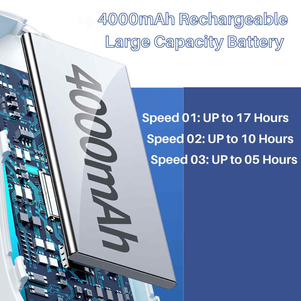 - Langvarig oppladbart batteri: Utstyrt med et høykapasitet oppladbart batteri på 4000mAh, gir denne USB-nakkeviften en pålitelig avkjølingsløsning over lengre tid. Si farvel til batterier du kaster og vær avkjølt hele dagen.