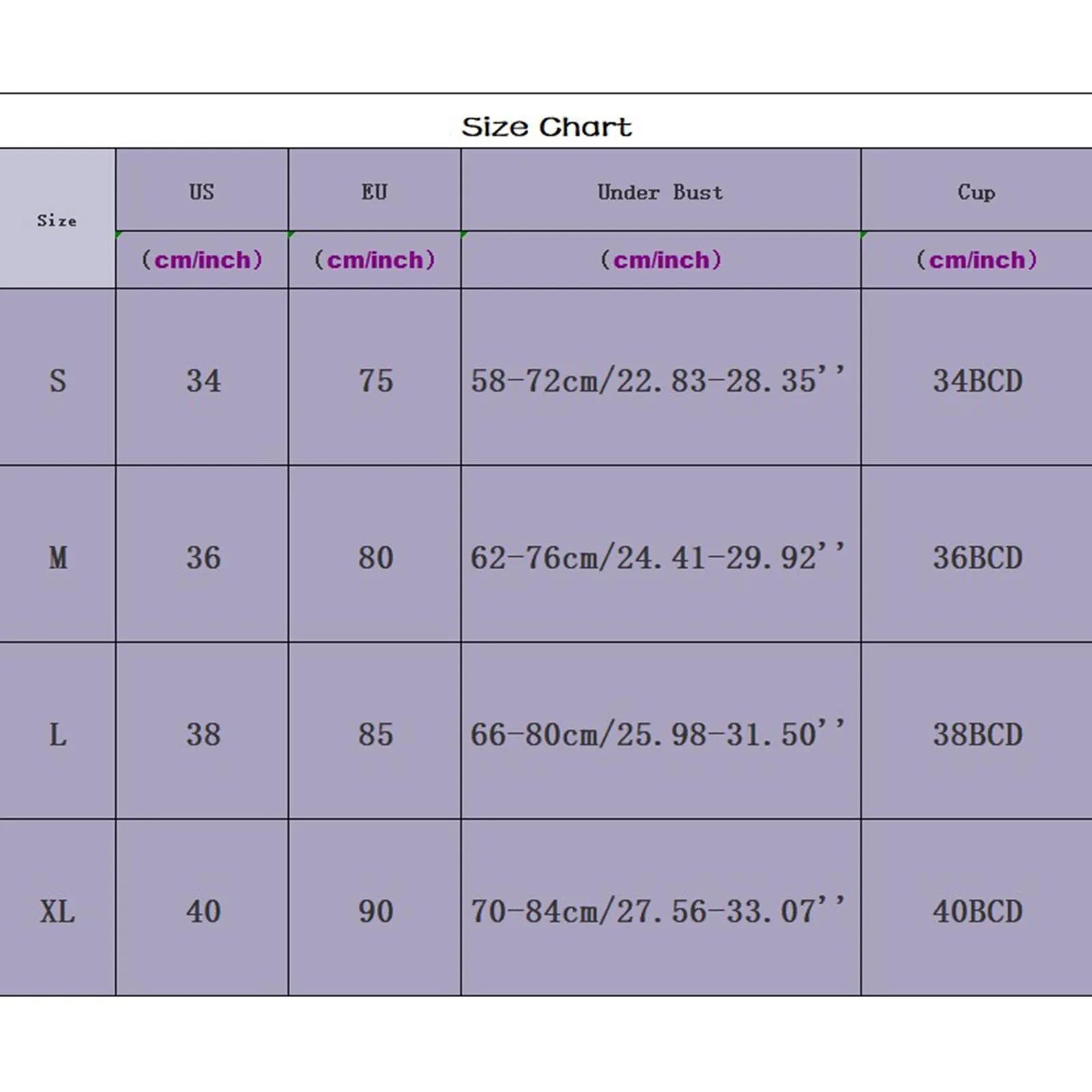 | Størrelse:L | US:38 | EU:85 | Under Bust:66-80cm/25.98-31.50'' | Kopp:38BCD |