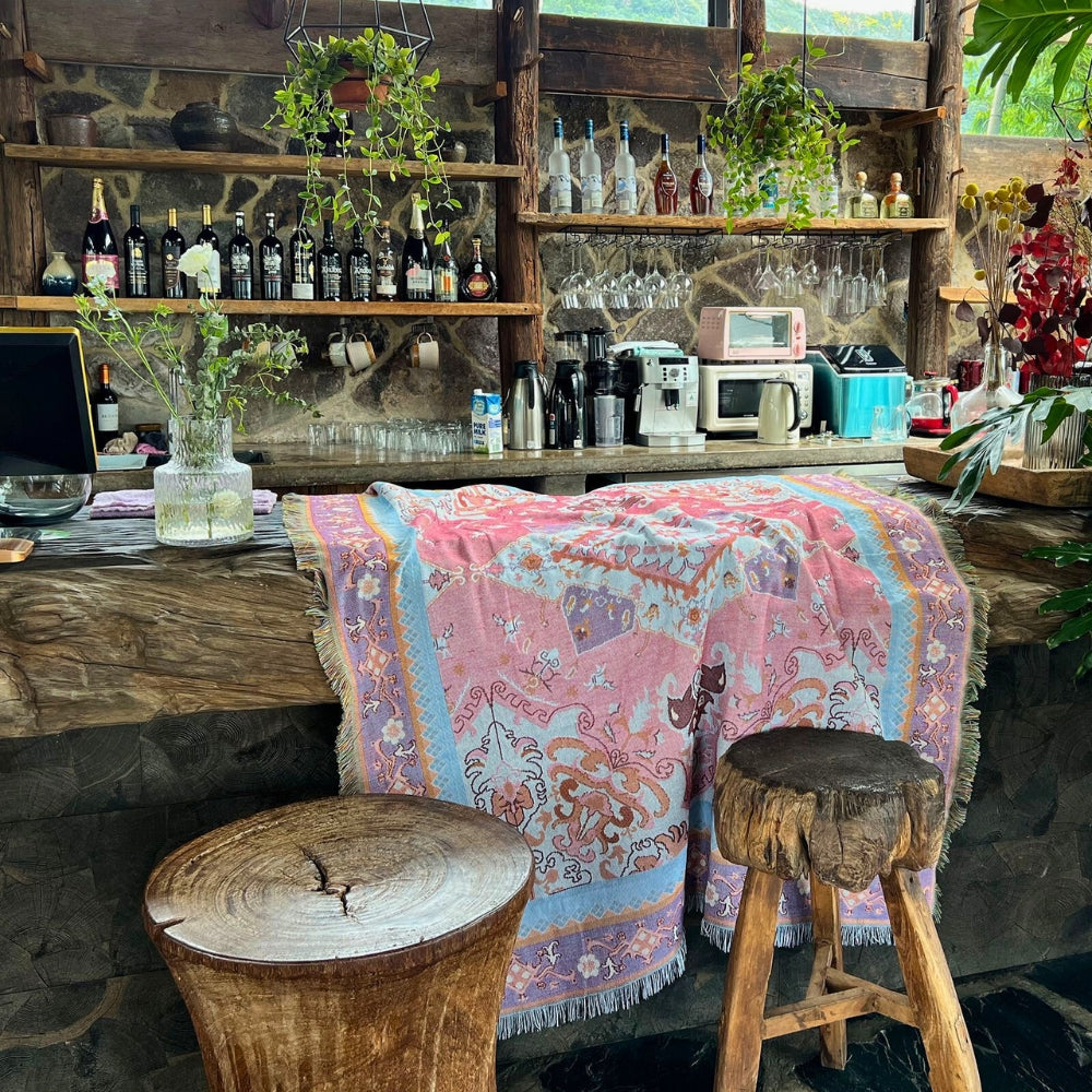 Forvandle rommet ditt med et snev av leken stil ved hjelp av dette bohemske aztekiske teppekastet. Dets unike design og dype farger skaper en hyggelig atmosfære som appellerer til dem som setter pris på særegne, uttrykksfulle rom. Enten det henger over sofaen, sengen, eller brukes utendørs, tilfører det varme og stil til ethvert miljø.
