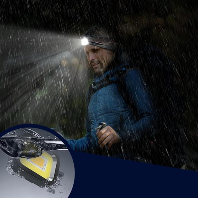Bygget for å tåle tøffe forhold, er denne hodelampen vanntett. Uansett om du jogger, camper, fisker eller er i nødsituasjoner, vil den alltid yte pålitelig. -