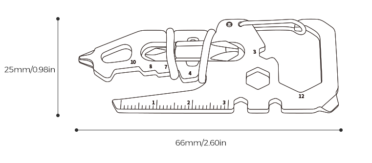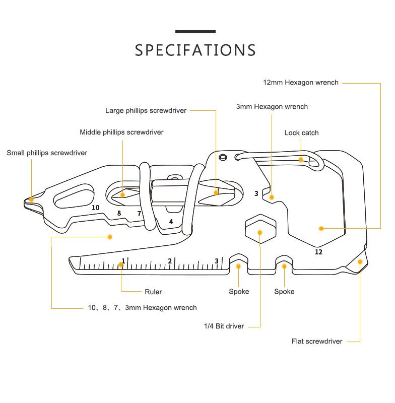 Variasjon av Egenskaper: Spenne, kortskjærer, nøkkelring, kompakt Phillips-skrutrekker, 3 cm linjal, HEX-nøkler for 3/4/7/8/10 mm, flatt skrutrekker, flaskåpner, nøkkel for sykkeldeler 3.3/3.5 mm, 1/4 bitsdriver.