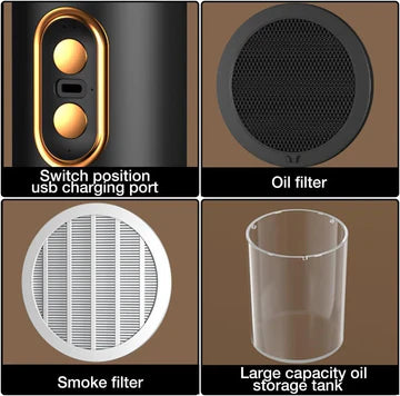 - Ekstra Funksjoner: Nyt enkel betjening med to hastighetsinnstillinger, avtakbar oljekopp for lett fettfjerning, og separate filtre for røyk og olje for ekstra bekvemmelighet.