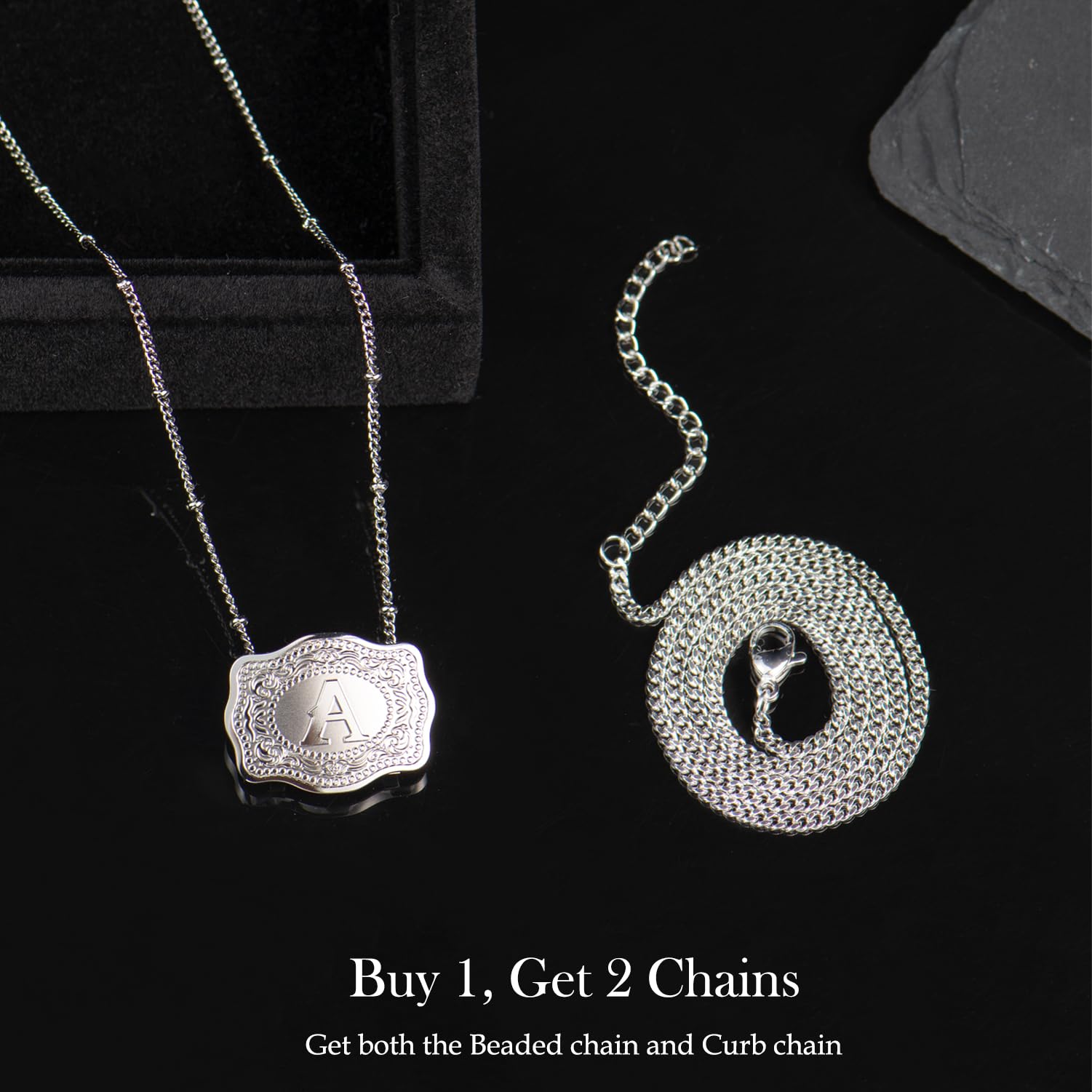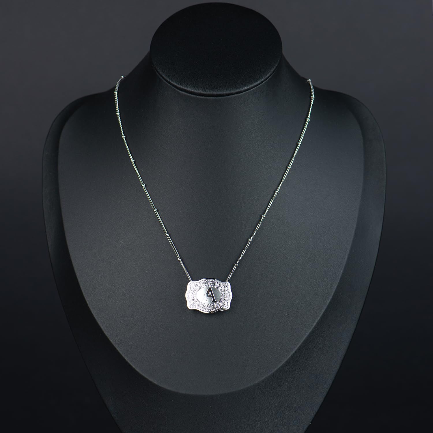 - Design: Dette smykket har en liten beltespenne-pendant, med utsøkte detaljer som innkapsler essensen av solid landlig sjarm. I sentrum av spennen er en personlig initial, som tilfører et unikt og meningsfullt aspekt til designet. Enten du forbereder deg til en rodeo eller ønsker å spice opp hverdagsantrekket ditt, utstråler dette stykket ren cowgirl-energi med en avslappet selvsikkerhet.