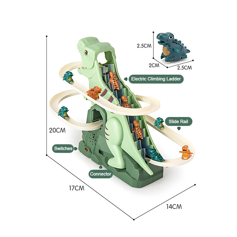 - Automatisk Trappetrinn Design: Leketøytrappen er lik en rulletrapp. Den kan sende dinosaurene til toppen en etter en. I tillegg kommer hver dinosaur med 2 metallhjul nederst, slik at den automatisk vil returnere til startpunktet når den sklir ned.