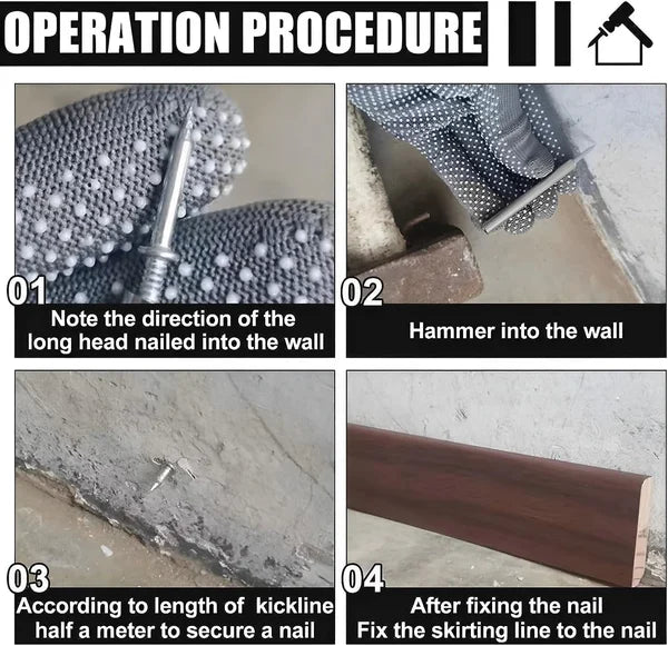 Si farvel til tradisjonelle metoder for installasjon av sokkel som etterlater stygge spikhull. Våre toveis non-marking negler krever ingen boring og fester sokler med bare to trinn.