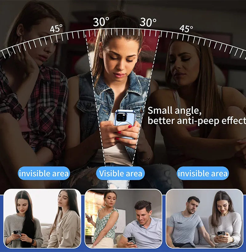 ● Personvernsikring: "Anti-Peep"-funksjonen indikerer at dekselet har en spesialdesignet teknologi som reduserer visningsvinkelen på skjermen. Dette hindrer nysgjerrige blikk fra personer i nærheten, noe som garanterer ditt personvern mens du benytter telefonen.