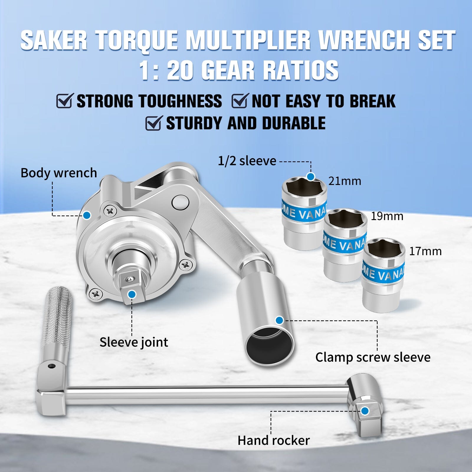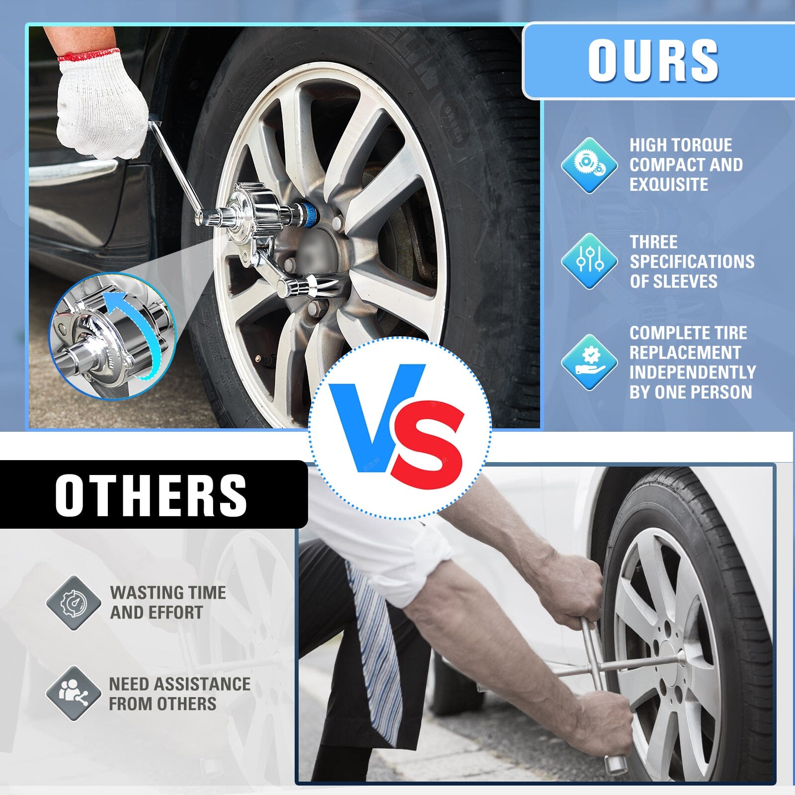 Utviklet for optimal brukeropplevelse: Dette momentforsterkerverktøysettet er designet av eksperter for å gi en kjapp og effektiv løsning for å løsne dekkbolter eller hjul. Med dette settet kan du oppnå det nødvendige momentet uten harde anstrengelser, noe som gjør det unødvendig å bruke kompressorer eller slagverktøy.