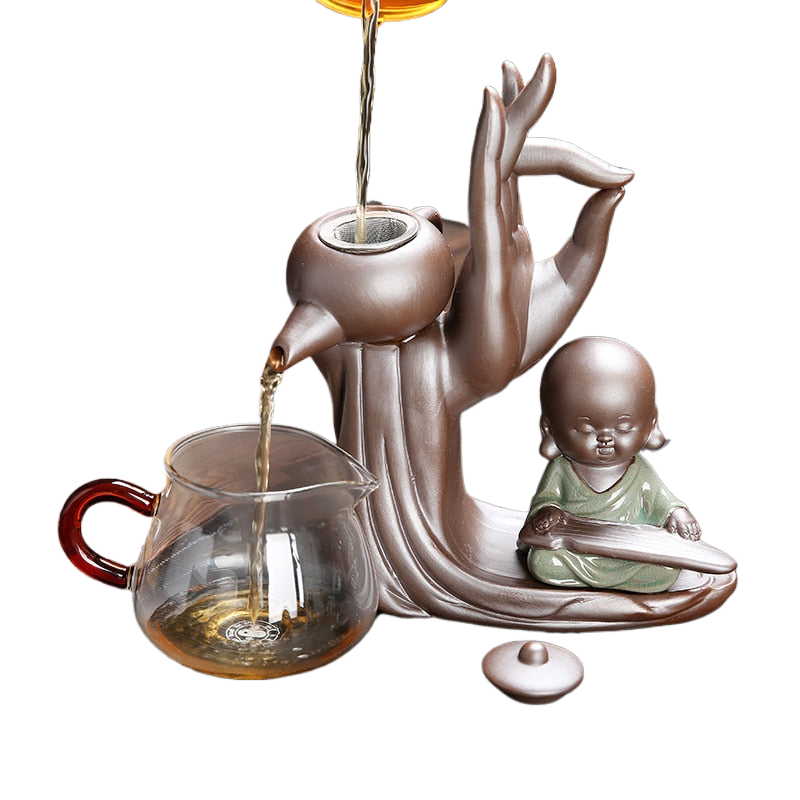 Elegant Ebony Te seremoni tilbehør sett for seks herrer, med sett i lilla leire, te drainfilter og liten munk dekorasjon