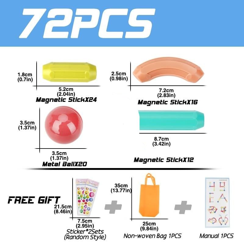 Med 25/36/42/64/72 biter i ulike former, kan barnet ditt velge mellom buede & rette former i forskjellige lengder, utvikle sin kreativitet og planlegge intrikate design med våre blendende PASTELLFARGER, som tenner fantasien og gir et kunstnerisk preg til hver modell, og forvandler hver dag til en fest med den ballonglignende stilen til magnetene.