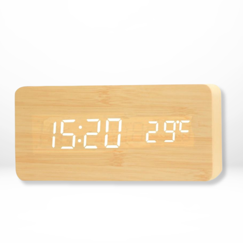Varmen fra naturlig tre bringer ro og harmoni til interiøret, mens den subtile LED-skjermen enkelt viser tid og temperatur. Det er et elegant tilbehør som kombinerer stil med funksjonalitet, perfekt for ethvert moderne hjem.