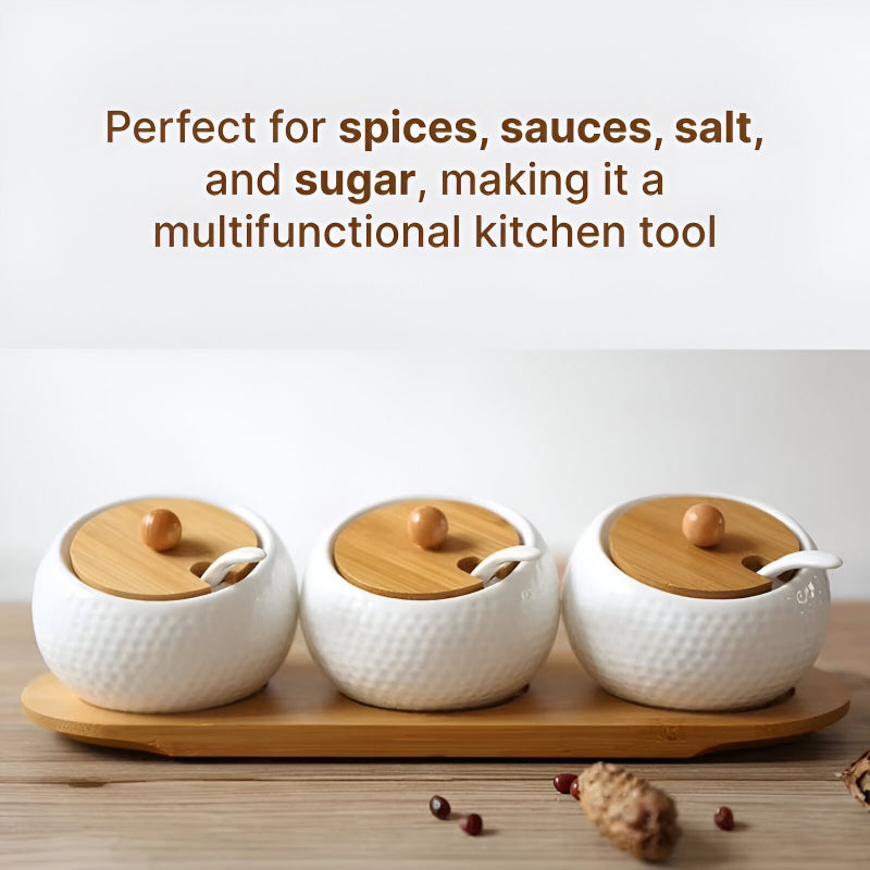 Forvandle kjøkkenområdet ditt til et stilrent og praktisk rom med vårt elegante keramiske oppbevaringskrukesett inkludert bambusfat. Dette vakkert designede settet er ideelt for oppbevaring av krydder, soyasaus, salt og sukker, og holder alle nødvendigheter pent sortert og innen rekkevidde. Laget av førsteklasses keramikk, gir hver krukke et preg av eleganse til matlagingsområdet ditt, samtidig som ingrediensene forblir friske og lett tilgjengelige.Nøkkelfunksjoner ved Keramisk Oppbevaringskrukesett