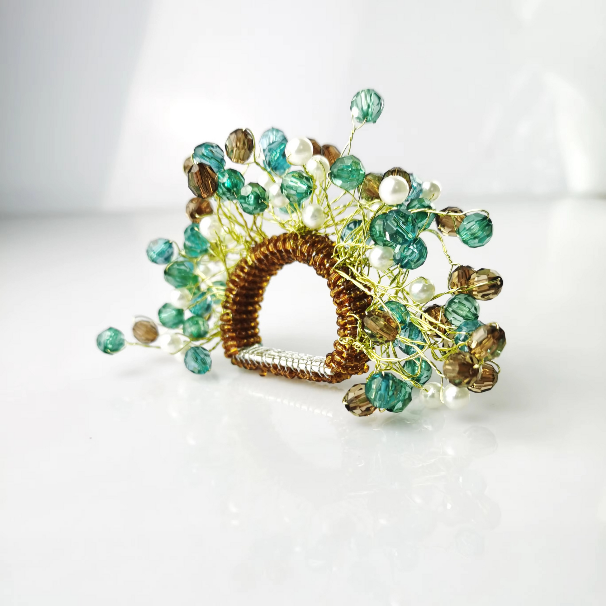 Hver serviettring er laget av slitesterke akrylperler arrangert på en robust sirkulær base. Den glatte overflaten sørger for enkel rengjøring og gjenbruk, mens det lette designet passer til både uformelle og formelle settinger.