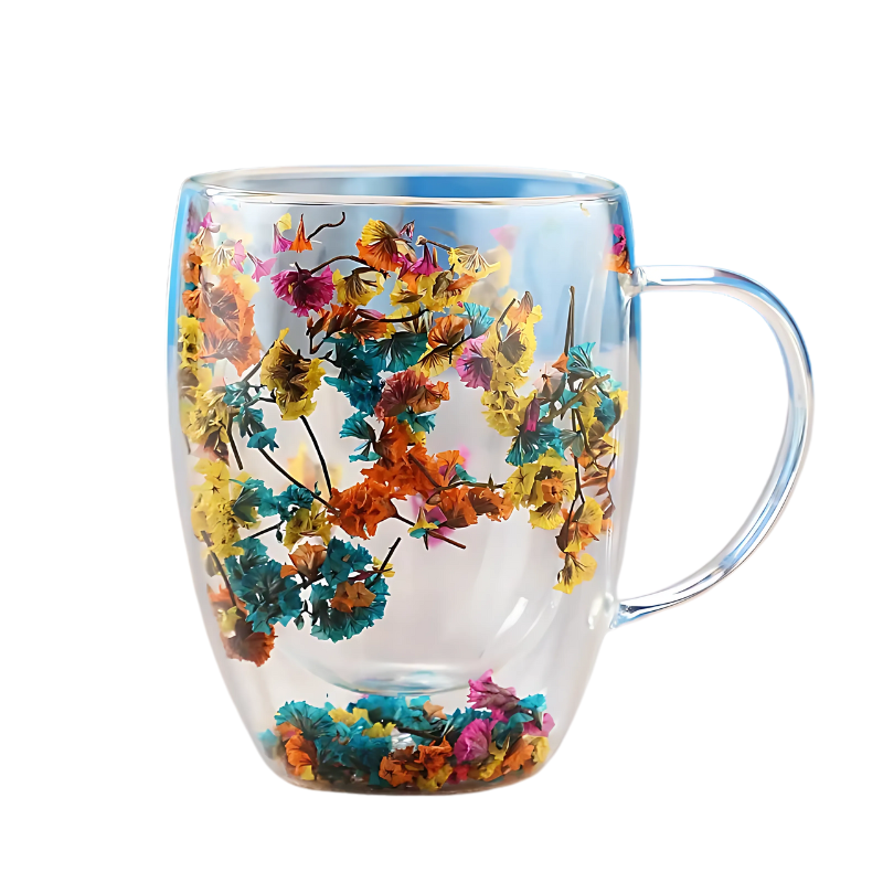 Oppdag gleden av forbedrede drikkemomenter med FloraMug, den dobbeltveggede glass cappuccino koppen som ikke bare opprettholder drikken din ved den ideelle temperaturen, men også gir en eksplosjon av estetisk glede med sitt fortryllende design av tørkede blomster.