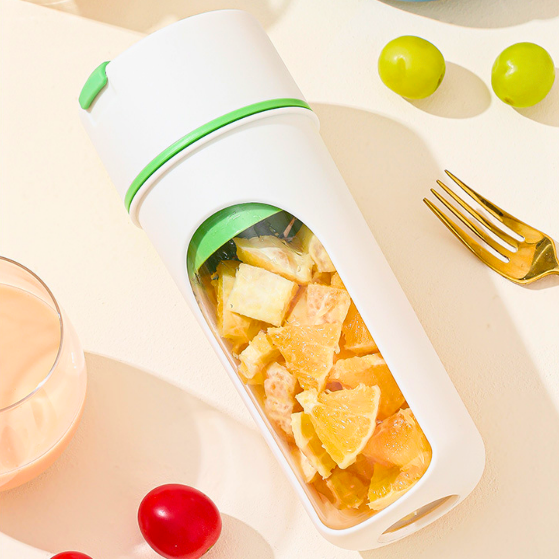 Er du glad i fersk, sunn juice, men har problemer med å finne tid i en travel hverdag? Vår bærbare juicer er den ideelle løsningen for å nyte næringsrike drikker på farten. Med sitt kompakte design og doble funksjonalitet er det lett å presse favorittfruktene og drikke direkte fra enheten, helt uten rot. Uansett om du er på treningsstudio, i kontoret, eller ute på ekspedisjon, vil denne lette, sterke juiceren smidig passe inn i din livsstil.