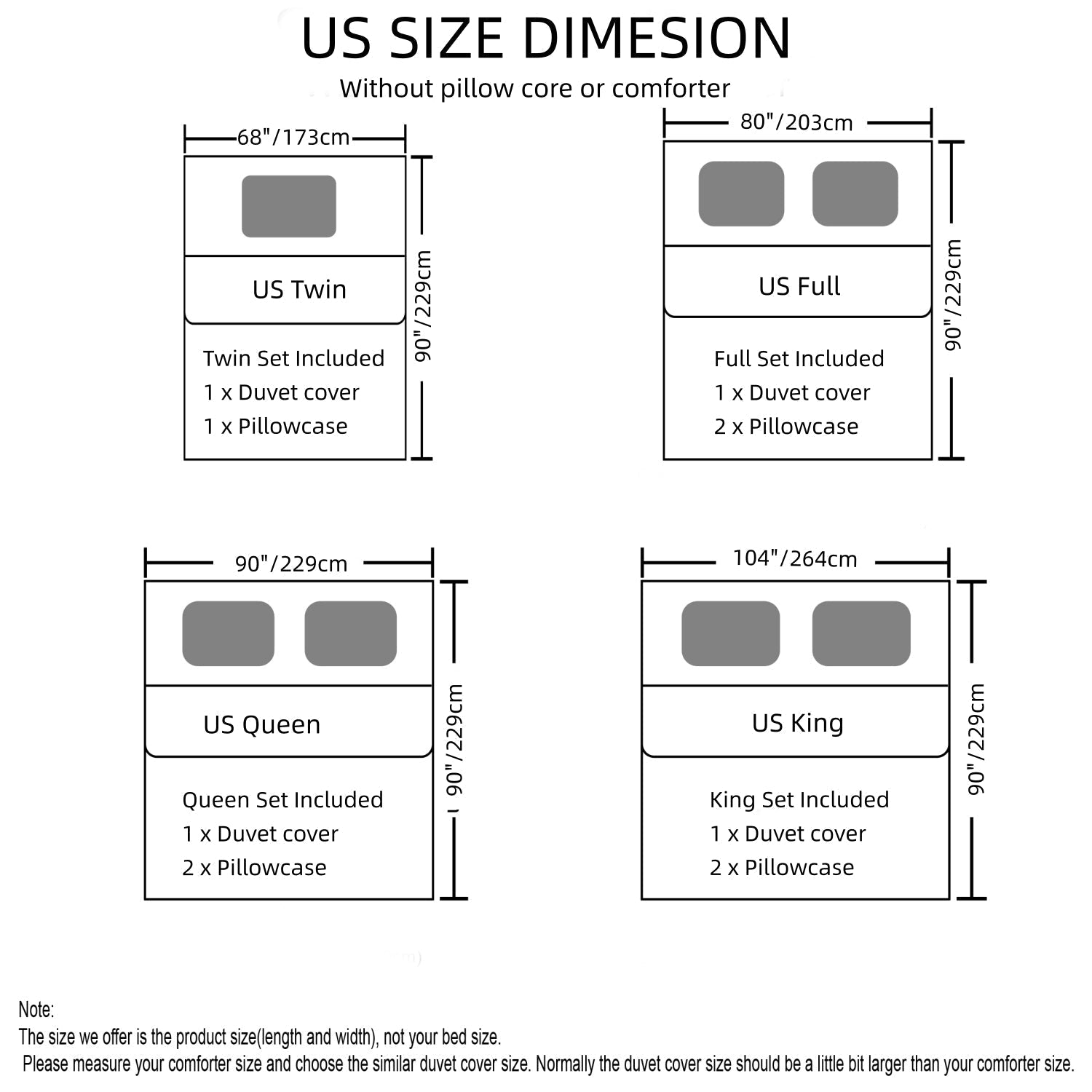 - Mål: 240 cm x 220 cm (dynetrekk), 60 cm x 70 cm (putetrekk)