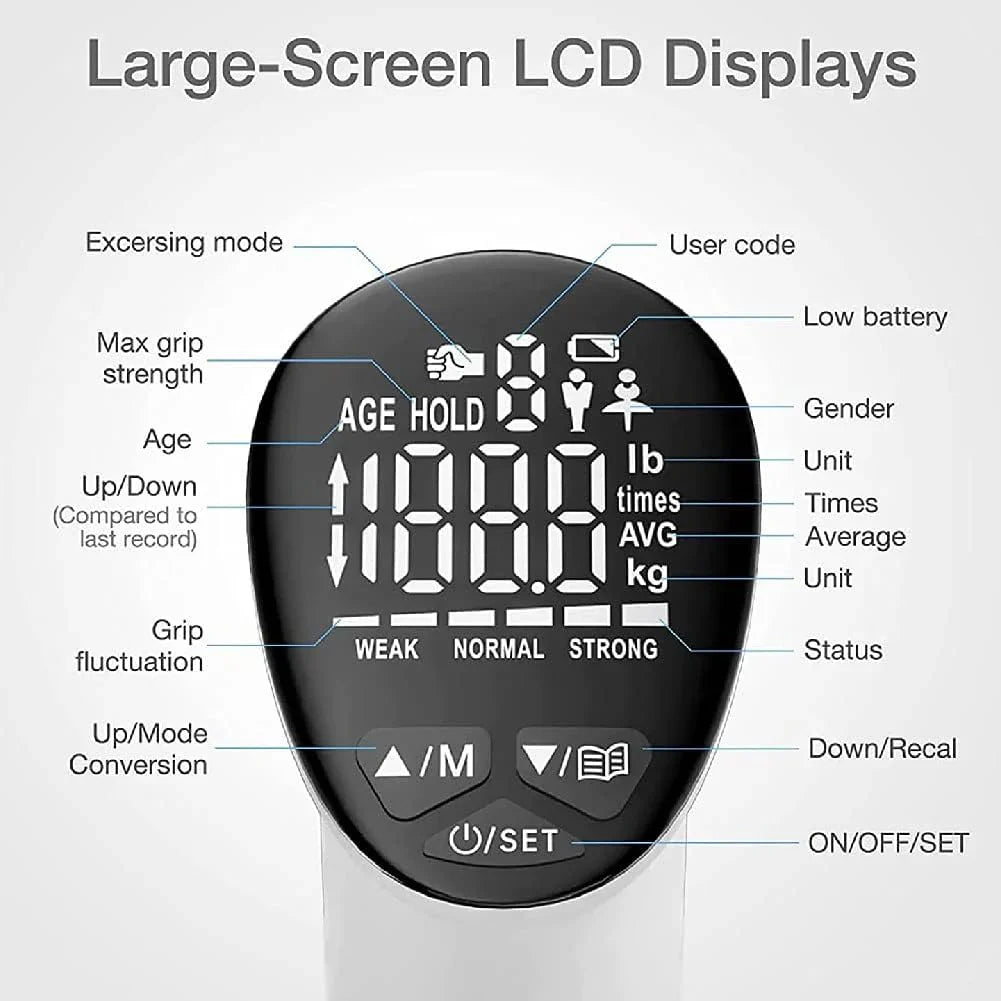 - 📊 Stort LCD-display: Viser all viktig informasjon om håndgrepstyrke, gjennomsnitt og utvikling på et enkelt blikk.