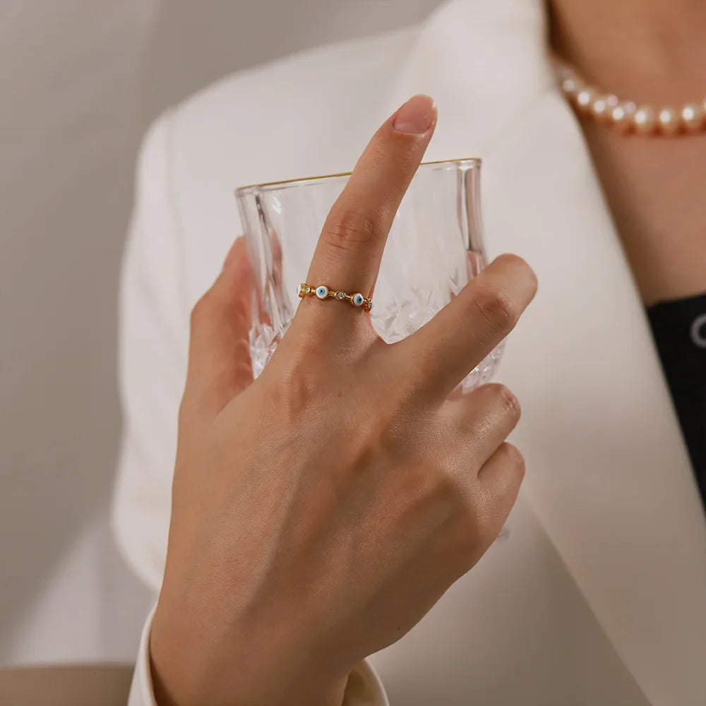 - Materiale: Nøye laget av høykvalitets 316L rustfritt stål, er ringen hypoallergen, motstandsdyktig mot misfarging og er designet for langvarig holdbarhet og glød. Den rike gullfinishen fremhever skjønnheten til de akryl onde øynene, mens zircon-diamantene tilfører en strålende touch som sikrer at stykket opprettholder sitt elegante utseende over tid.