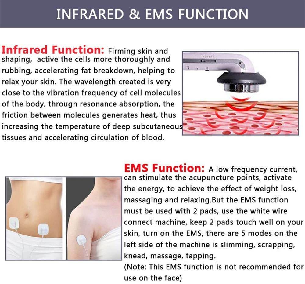 - Funksjoner: Slanking av kropp, armer og ben; hudstramming; lymfatisk drenering; avgiftning.