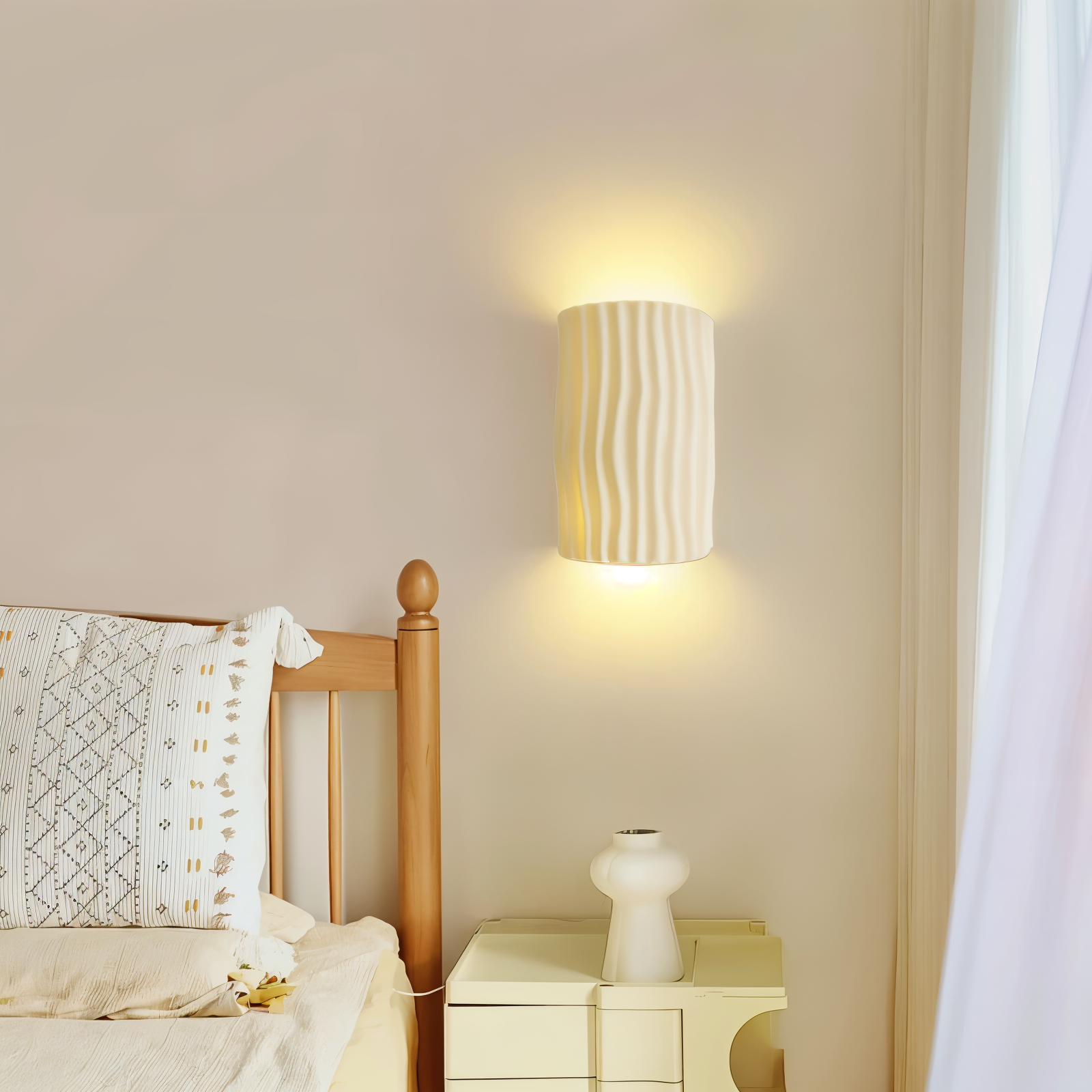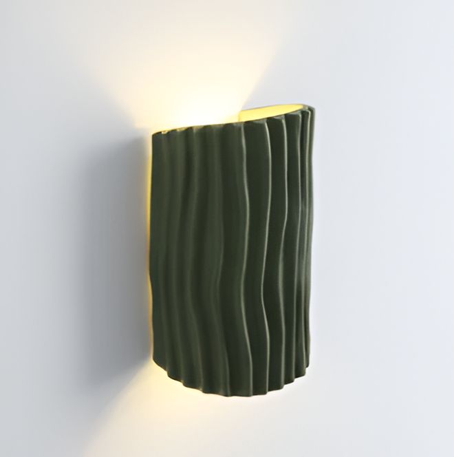 Lampen, laget av høykvalitets harpiks, skiller seg ut med sitt plissert design og buede form. Dette veggelyset med opp-og-ned svingning gir en myk og harmonisk belysning, perfekt for å heve atmosfæren i stuer, ganger, soverom og til og med kontorer.